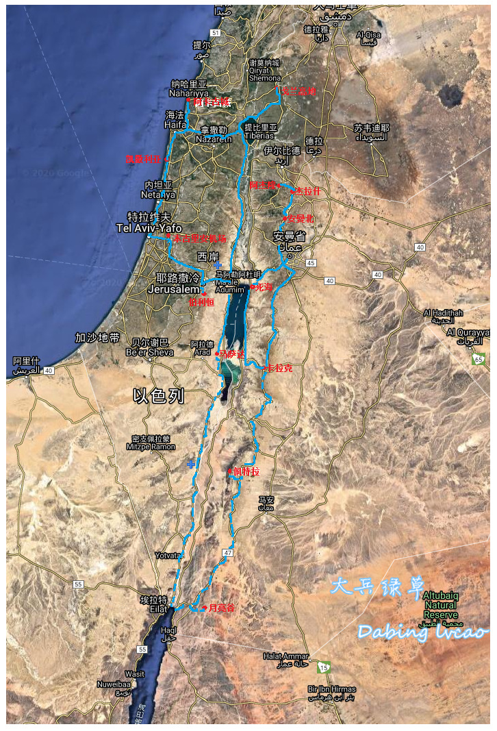 图—1 2019年冬以色列、约旦自由行路线图