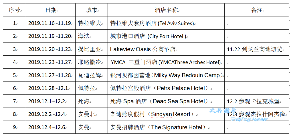表—1 2019年冬以色列、约旦自由行行程表