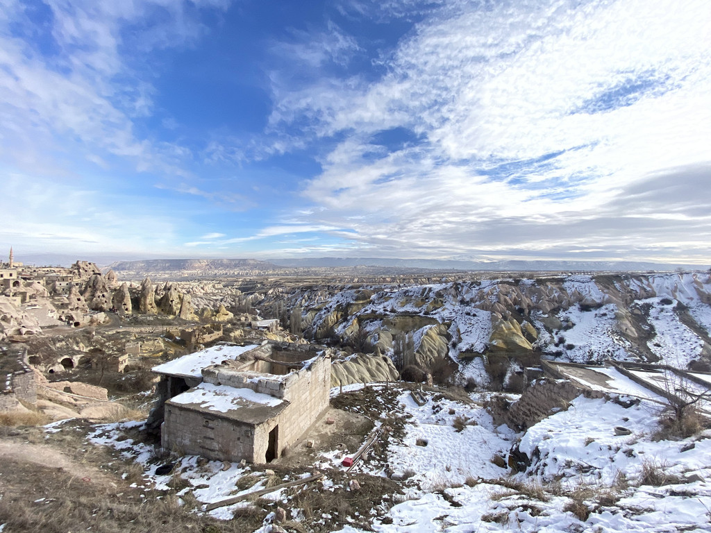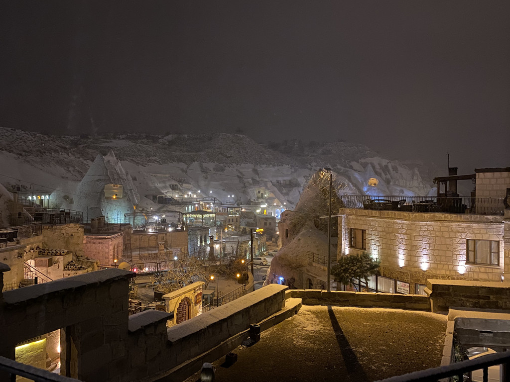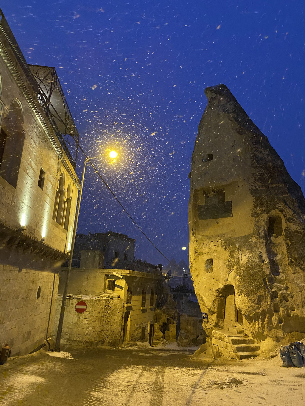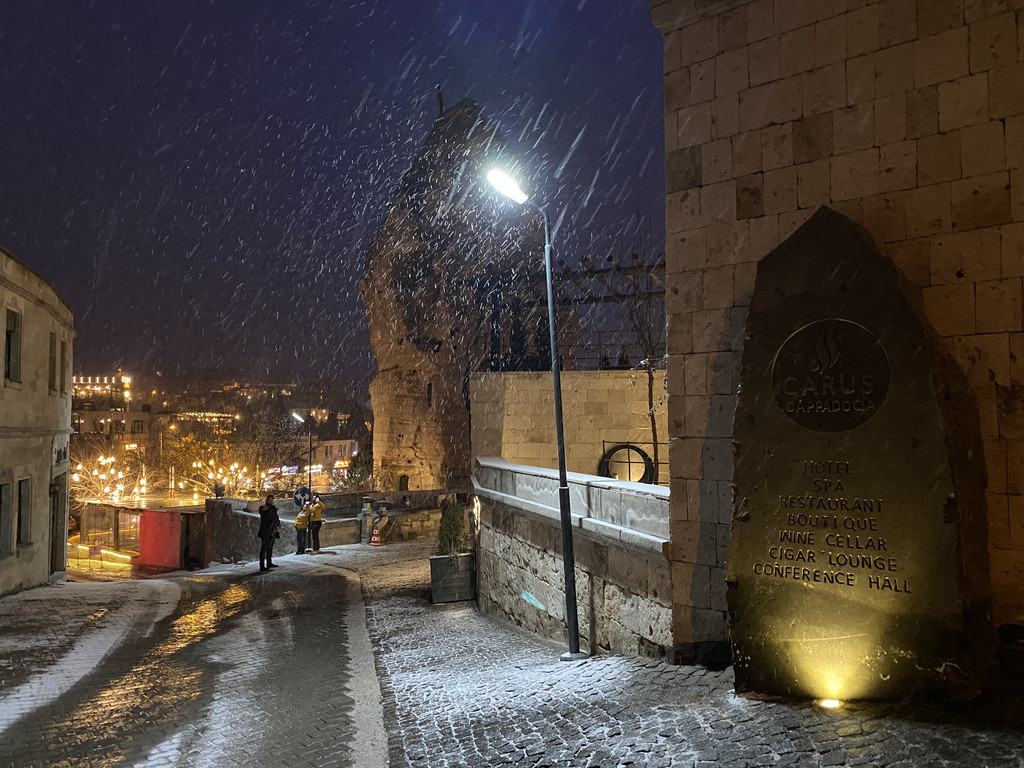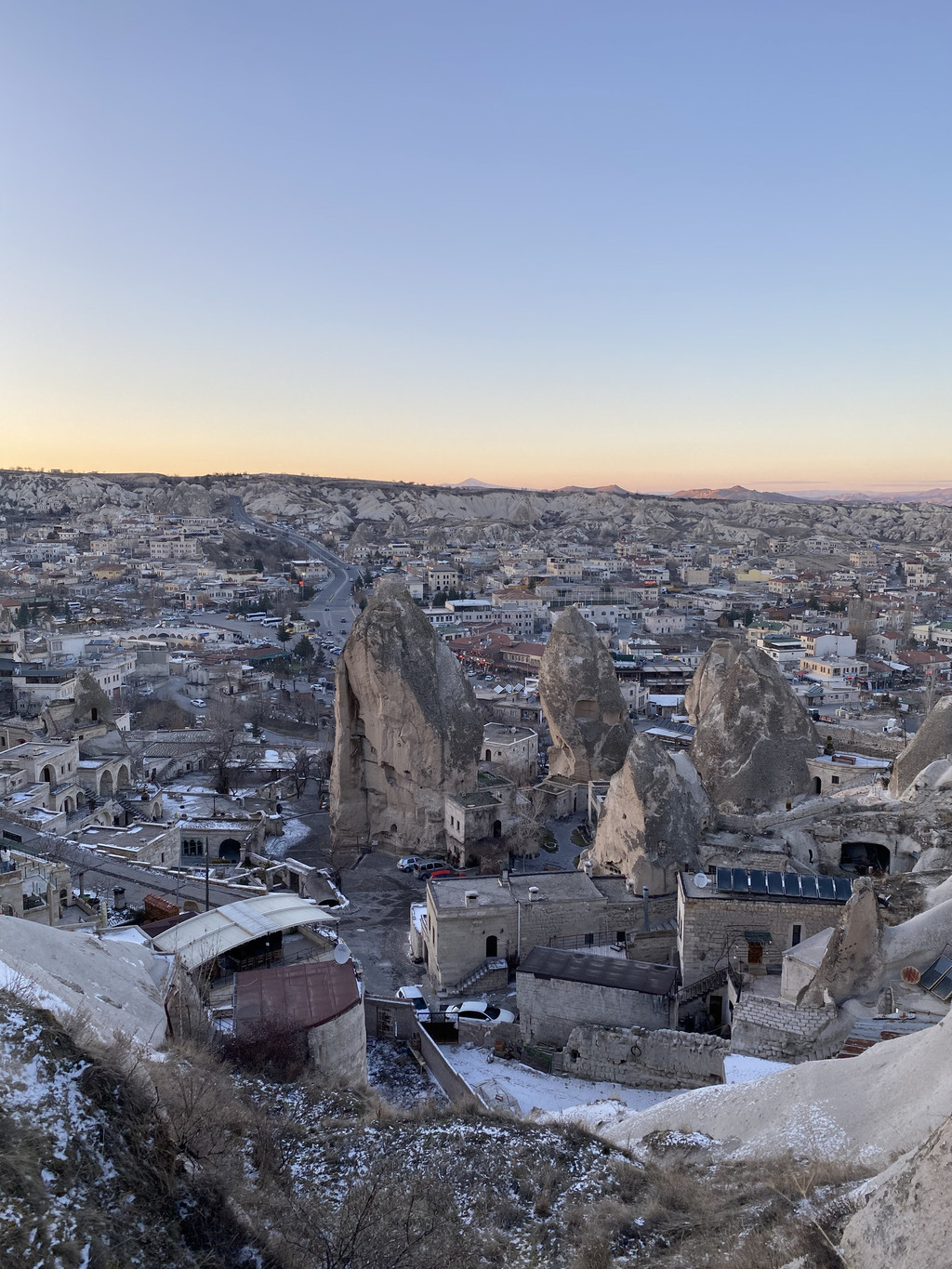格雷梅小镇位于卡帕多奇亚,这里也就是土耳其最负盛名的旅游地了,这里云集了造型各异的仙人烟囱岩,被景色宜人的玫瑰谷、鸽子谷所环抱。对土耳其本身最大的期待应该就是飞屋环游记那种“最接近上帝视角”的热气球,可惜我们在卡帕多奇亚的那几天要么是下雪要么是刮风,到最后也没有体验到热气球,但也因此解锁了很多未曾好好感受的美丽风景。
