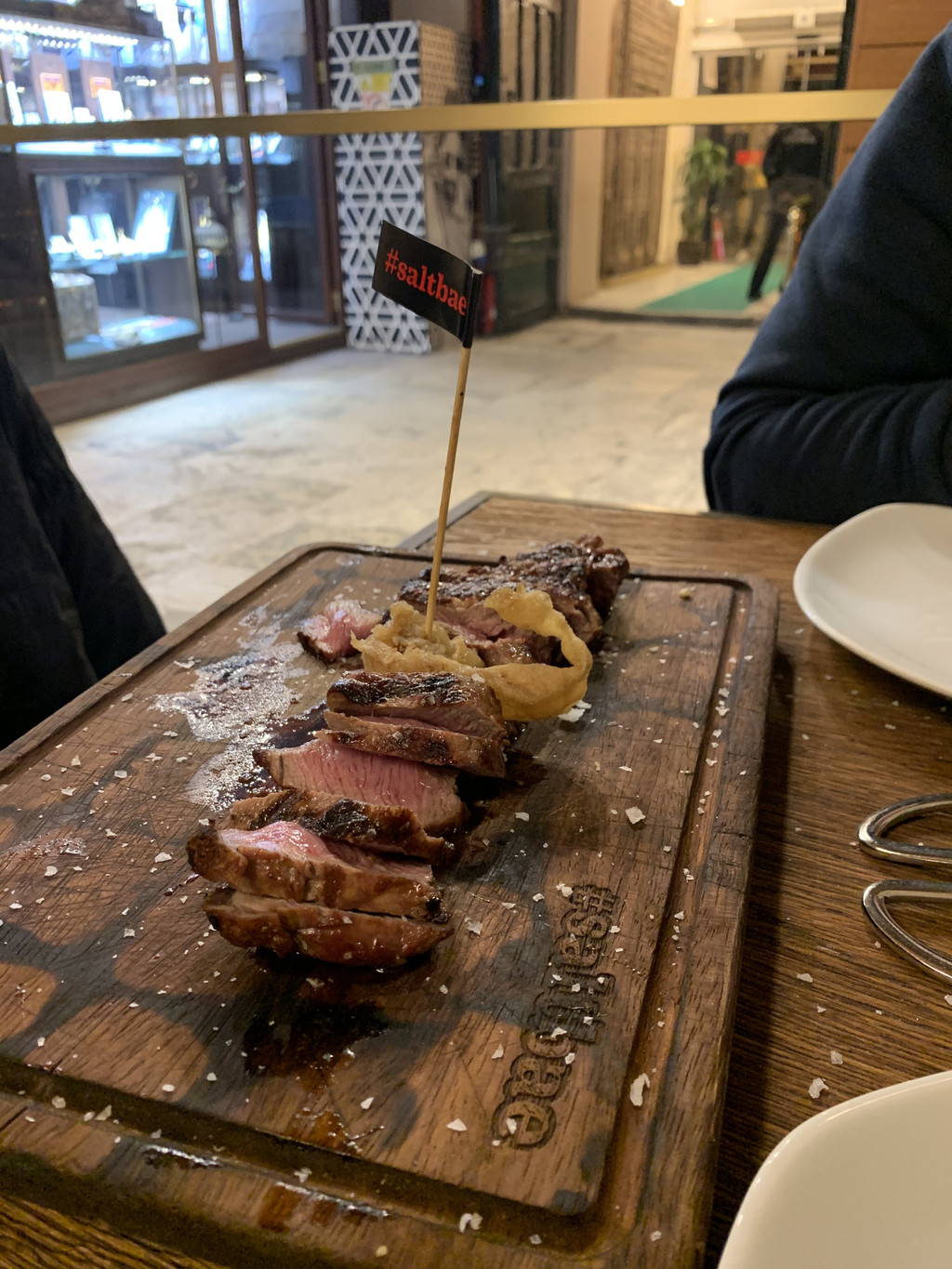 晚上我们去了闻名国内已久的“撒盐哥”牛排体验了一下土耳其式的网红店,但毫不夸张的说撒盐哥是我们此次行程最失败的一笔,也是土耳其行程中唯一吃拉肚子的一次,服务差价格贵品质一般,确实是妥妥的网红店。