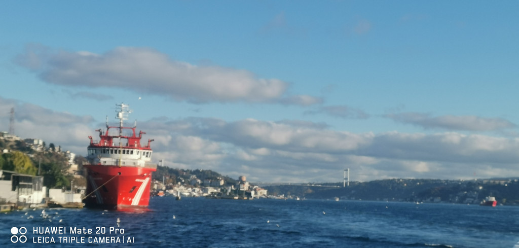 过桥后岸边停靠着一艘橘红色的土耳其海岸警卫队的大船。
