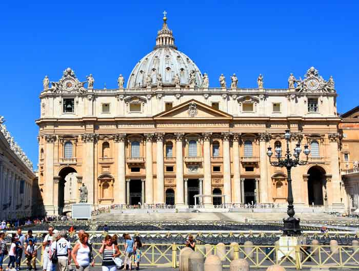 圣彼得大教堂由于设计融合了对称美学、透视美学、比例学等原理,具有高度的科学性,外观予人的视觉和谐而庄重,其廊檐上方有以耶稣为中心的11尊雕像,两侧各有一座显示格林威治时间与罗马时间的时钟,教堂正中有一个米开朗基罗设计的距地面高达137.8米、周长71米的圆形穹顶,不仅是梵蒂冈城的制高点、也是全罗马城的最高点;教堂设有5个门可以入内,但其右侧的“圣门”,据说每25年的圣诞之夜才开启一次,故一般游客很难遇上那样的机会。