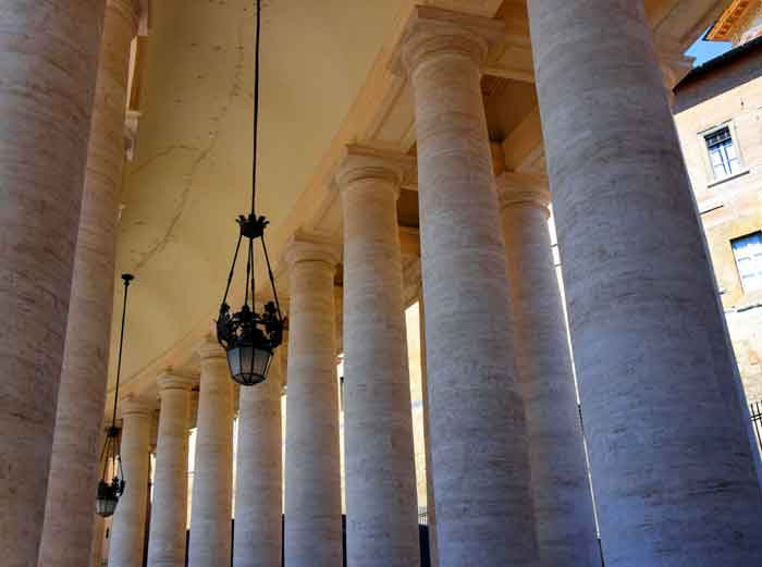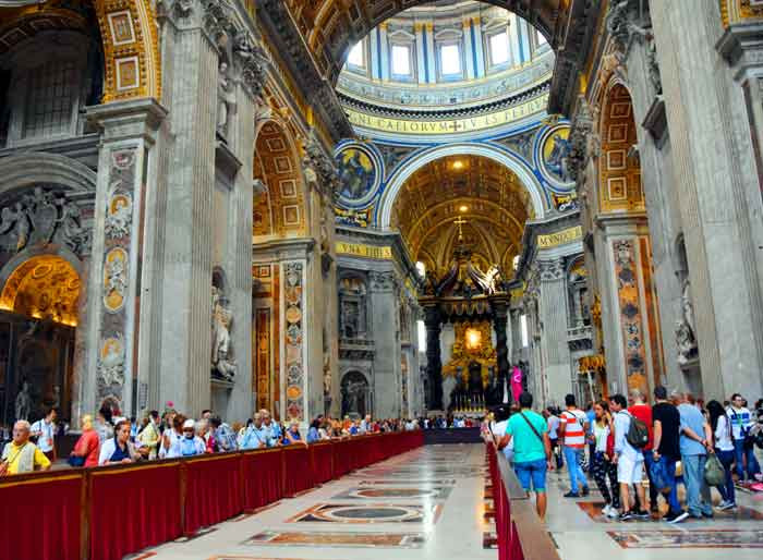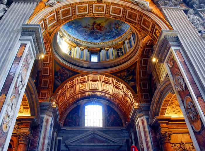 说话间来到位于圣彼得广场西侧的圣彼得教堂这座建筑前。走进梵蒂冈城国的这座世界著名的圣彼得大教堂内,只见内中金碧辉煌的建筑规模景象令人叹为观止。里面的众多壁画因全是马赛克制作的,故允许使用闪光灯拍照,这也是与众多文化博物馆场所不同的地方。