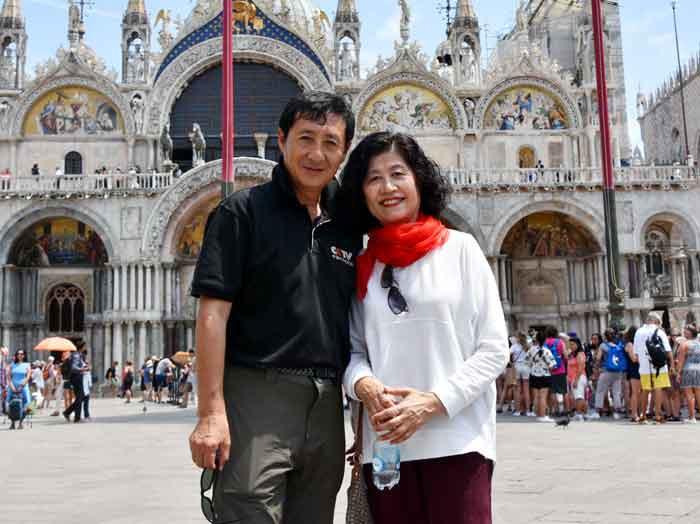 团友们结束了贡多拉泛舟威尼斯水城游后登岸来到陆地上继续观光。首先来到威尼斯最著名的名胜古迹之一的圣马可广场和圣马可教堂。圣马可广场东西长170多米,东边宽80米,西边宽55米,总面积约1万平方米左右,呈梯形。它们造型的优美、和谐,石雕的生动、逼真,可以说是古罗马建筑中少有的杰作。广场南、北、西三面被宏伟壮丽的宫殿建筑环绕。这些建筑和谐优美,建筑物上的石雕生动逼真。