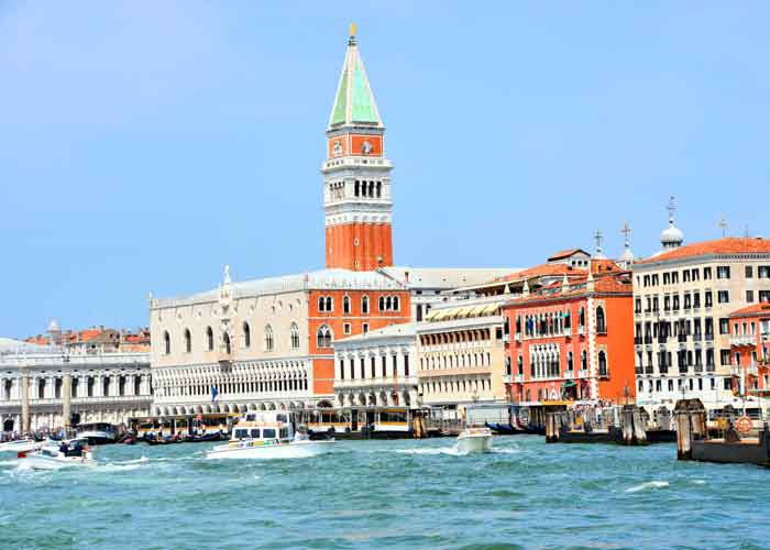 在圣马可广场东面耸立着高98.6米的圣马可钟楼和融东西方建筑艺术为一体的圣马可教堂。西面是总督宫和圣马可图书馆。严整、华丽的总督宫,用粉红色和白色的大理石砌成。总督宫是威尼斯国家元首的府第,也是大议会和政府的所在地。圣马可大教堂和总督宫毗连是威尼斯的骄傲,威尼斯的荣耀,威尼斯的富足。当然,还有威尼斯的历史和信仰,尽在于此。