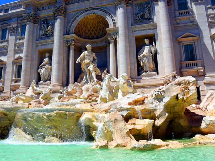 许愿池是意大利罗马市内最大的也是知名度最高的喷泉。总高约25.9 米,宽约19.8米,是全球最大的巴洛克式喷泉。喷泉的主体在海神的前面,泉水由各雕像之间、海礁石之间涌出,流向四面八方,最后又汇集于一处。池中的一个巨大的海神雕像,驾驮着马车,四周环绕着西方神话中的诸神,每一个雕像神态都不一样,栩栩如生,诸神雕像的基座是一片看似零乱的海礁。
