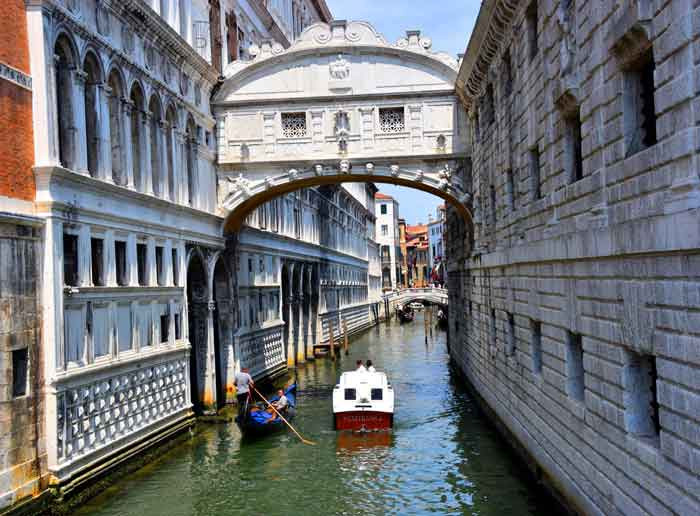 叹息桥建于1600年,是威尼斯的必访景点之一。该桥的造型属早期巴洛克式风格,桥呈房屋状,上部穹隆覆盖,封闭得很严实,只有向运河一侧有两个小窗。由于这座叹息桥连接着法院和监狱,故死囚被押赴刑场时经过这里,常常会发出叹息声而得名。后来叹息桥被演绎成充满爱情气息的名桥,成了威尼斯的著名景点。每年都有成千上万对年轻情侣,来威尼斯旅游或是举办婚礼。他们乘上温馨浪漫的情侣贡多拉,在穿过叹息桥的瞬间热烈拥吻,以此来见证他们的爱情天长地久。