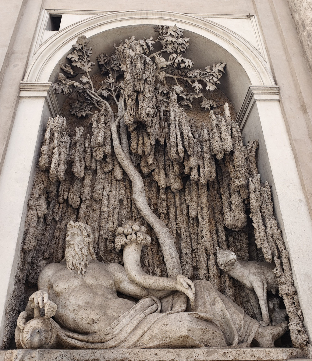 四喷泉顾名思义由四座喷泉组成,分别为:台伯河河神(象征罗马)、阿诺河(象征佛罗伦萨)、月亮女神与狩猎女神狄安娜、天神朱庇特之妻朱诺。这四座喷泉位于奎里纳尔山山顶的一个十字路口,修建于1588年至1593年间。喷泉旁边是由波罗米尼设计的四泉圣嘉禄堂。