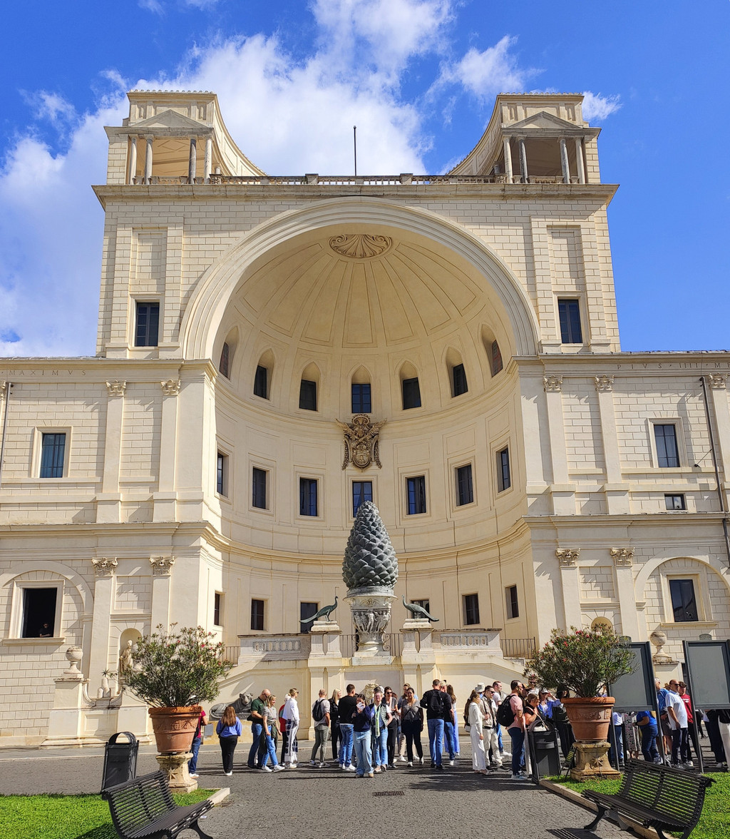 松果庭院最重要的参观部分便是松果喷泉,青铜松果高约4米,原本位于万神殿附近,在中世纪被移动到老圣彼得教堂的庭院,后来又于1608年移至现在的位置。喷泉两侧的青铜孔雀是圣天使城堡装饰的复制品。