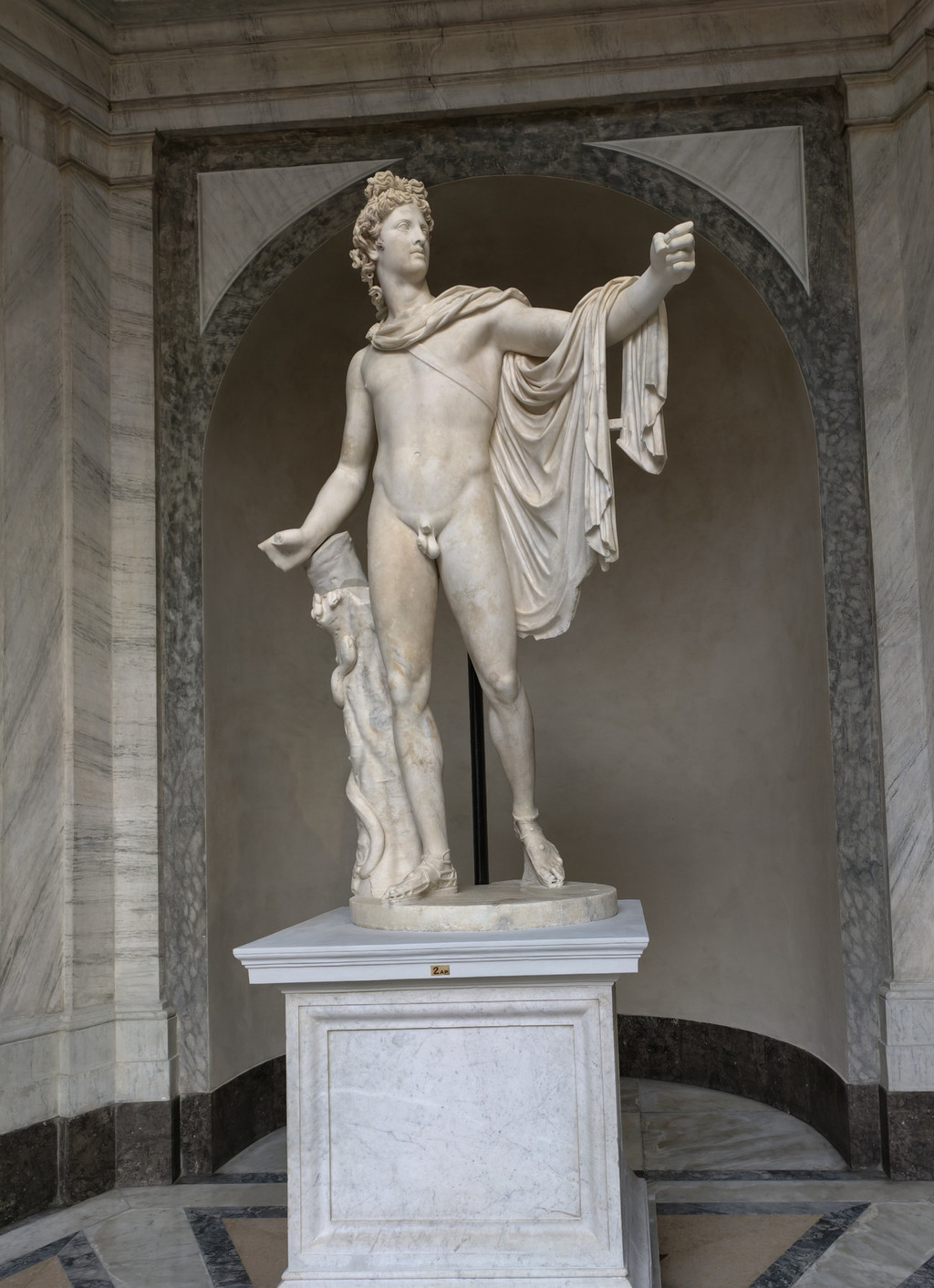 《望楼上的阿波罗》高2.24米,雕刻于公元120–140年间,这座白色大理石雕塑是公元前350–325年古希腊雕塑家Leochares的青铜雕塑仿制品。
