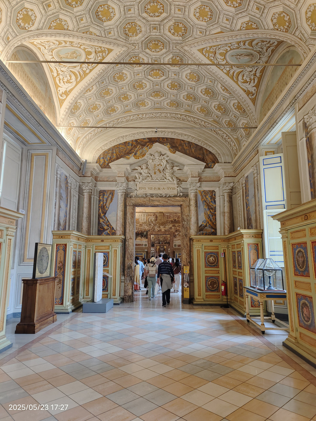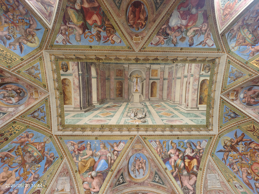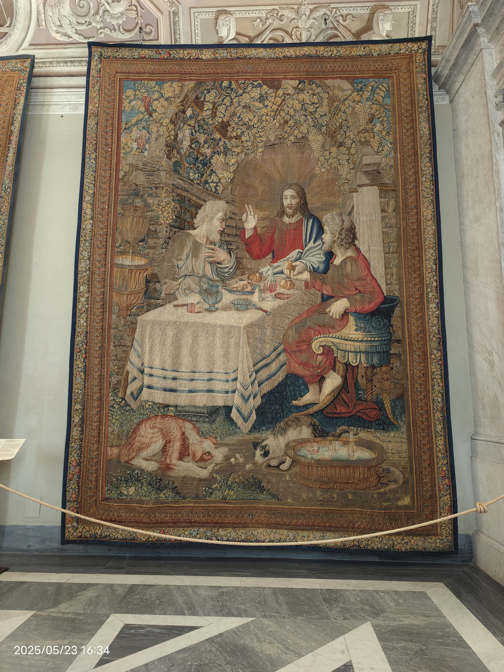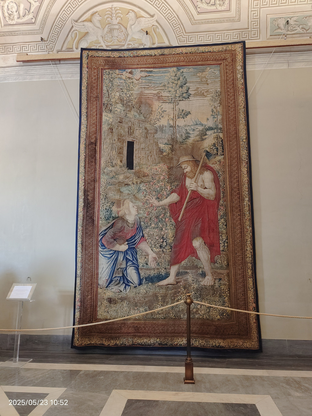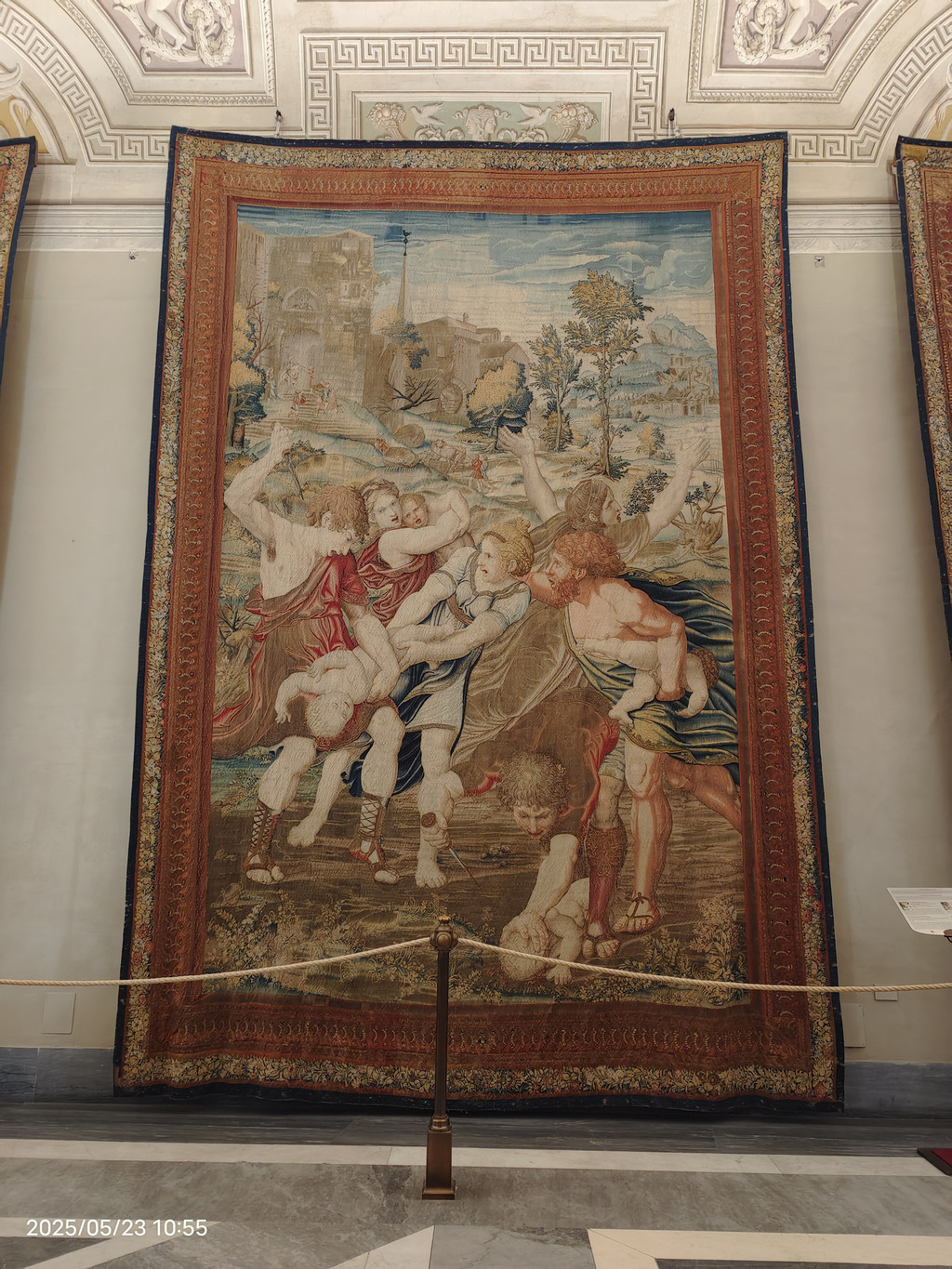 《挂毯室》是某一任教宗为了扩充展区,于外墙走廊加上屋顶而成,展区分为新与旧,旧挂毯区是希腊罗马织品,新挂毯区则是拉斐尔及其弟子设计,以耶稣故事为主题的壁毯,推荐一定要现场来看看,因为挂毯创作之时是没有纺织机的,所以你可以看到这些人工编织的精细度。