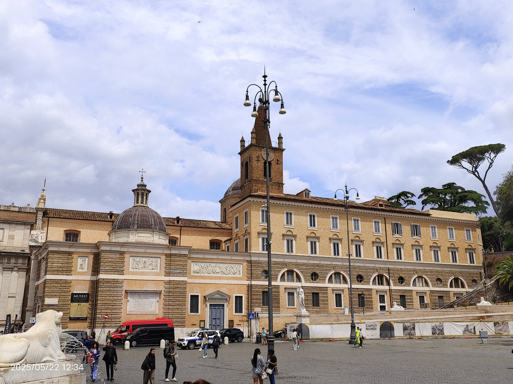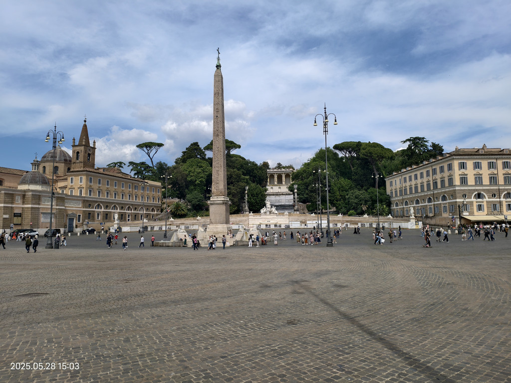 罗马人民广场位于罗马城北端波波洛城门(或弗拉米尼亚门)前,始建于17世纪,由建筑师丰塔纳设计,朱塞佩·维拉迪尔于1815年完成扩建时增设中央喷泉,并在方尖碑旁添加四座埃及狮子雕塑及十六尊狮身人面像 。广场呈巨大椭圆形,中央矗立着高23.2米的埃及方尖碑,该碑于公元前10世纪为法老拉美西斯二世所立,1589年由教皇希克斯塔斯五世迁移至此。北侧波波洛城门始建于公元220年弗拉米尼亚大道建成时期,为连接罗马与亚得里亚海岸的重要门户。
