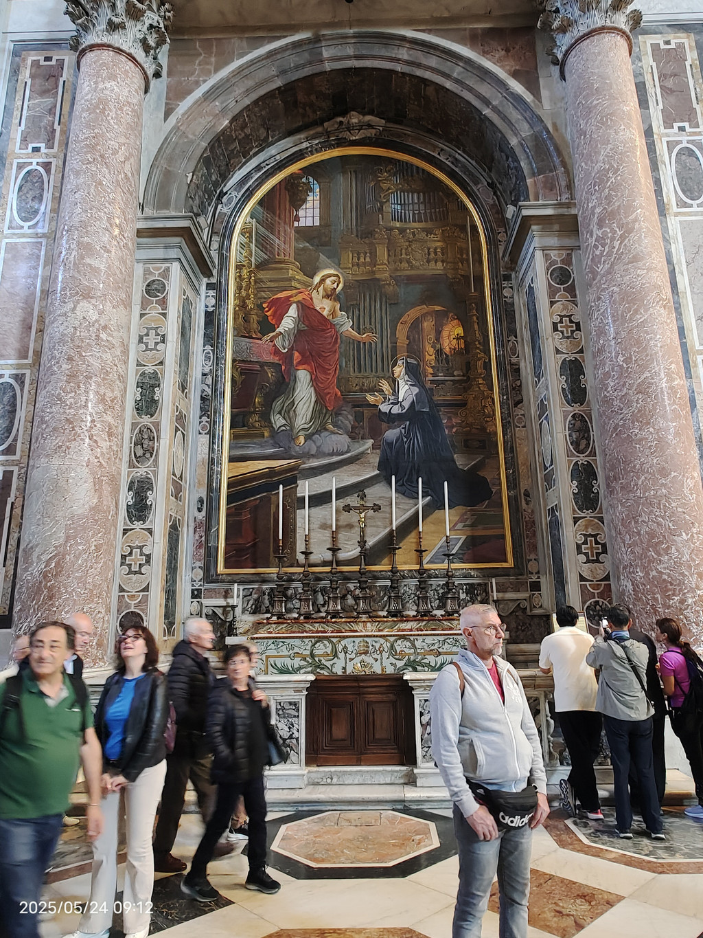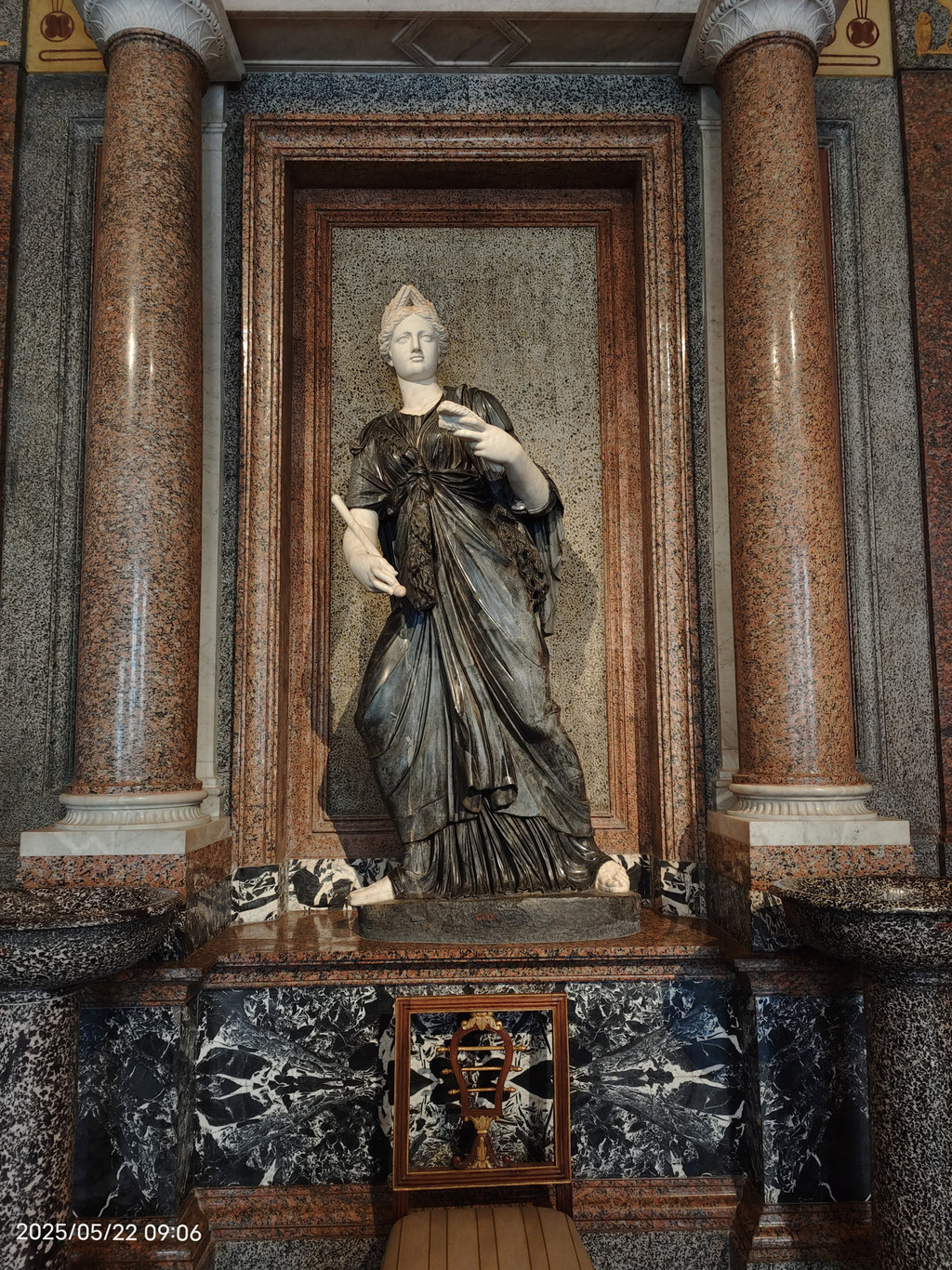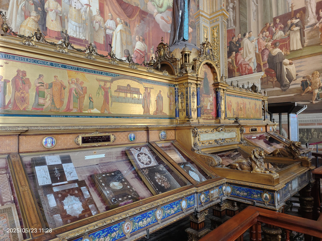 接着来到教宗庇护《五世画廊》,这里有一间圣母无染原罪室,里头有一尊黑袍蓝衣的圣母,后方的壁画为 1858年罗马教宗庇护九世委托当时最有名的意大利弗朗切斯科·波德斯蒂