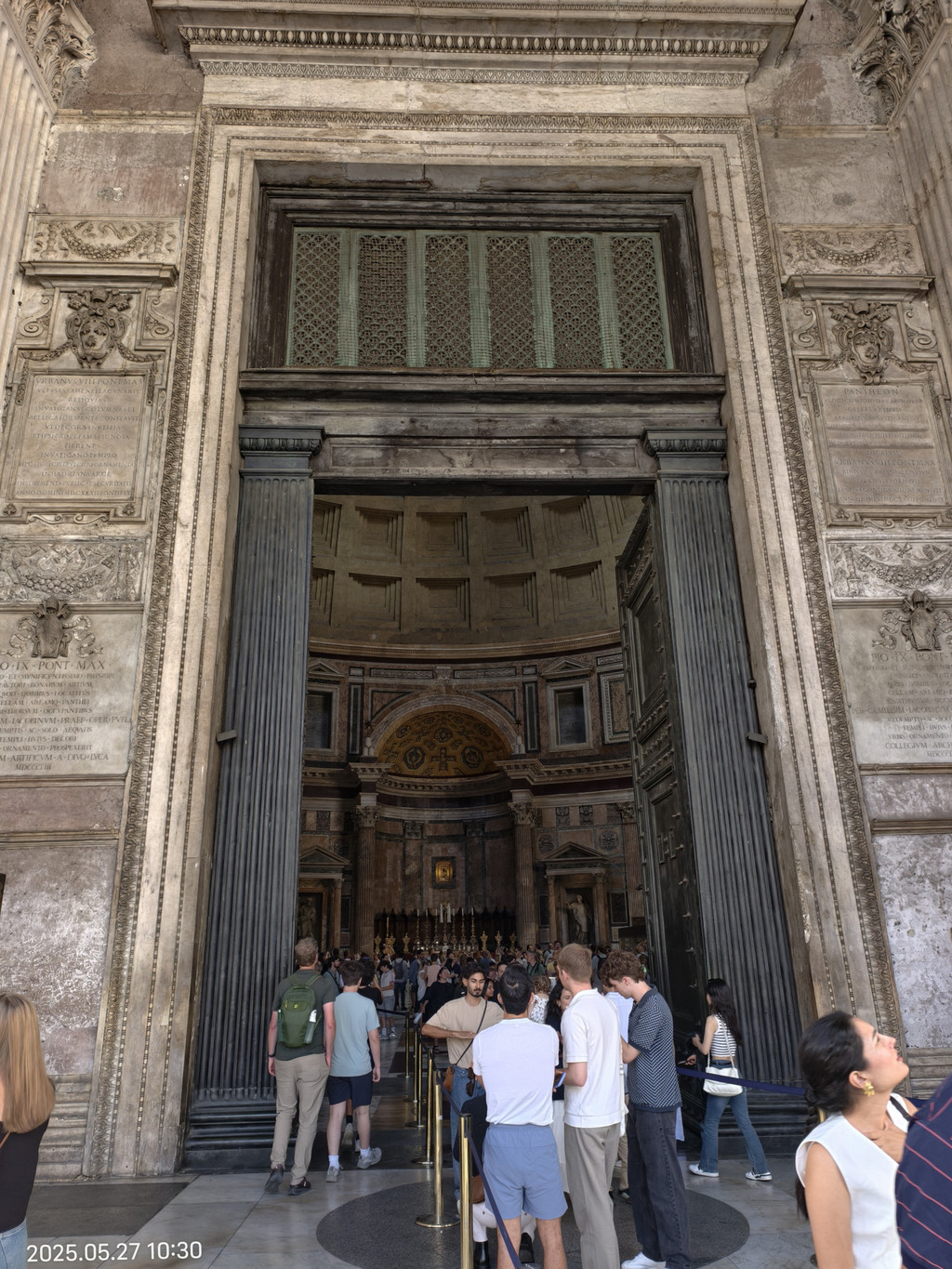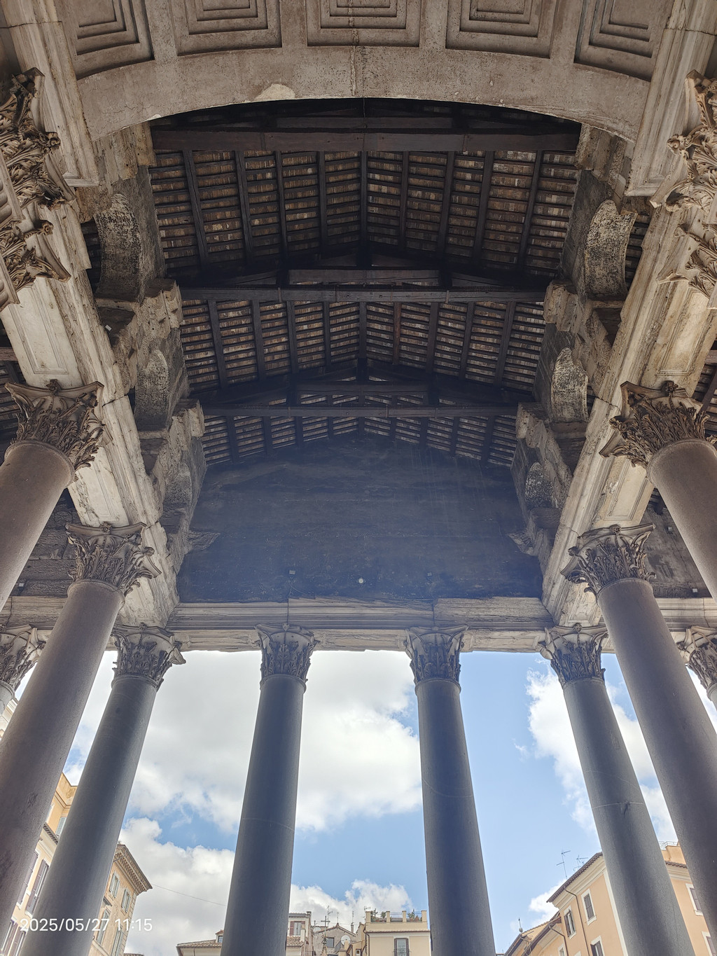 万神殿正门,是希腊式柱廊,由16根花岗岩圆柱支撑,这些石柱是从埃及的采石场运来的,显示了罗马帝国的强大。