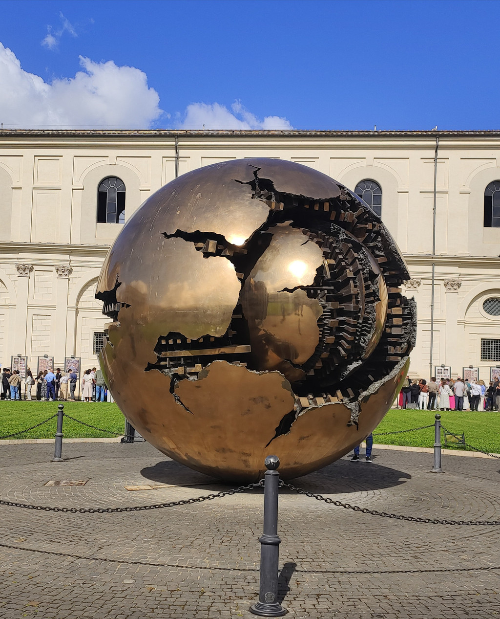 松果庭院另一件重要的艺术品为位于庭院中央的现代雕塑——破碎的地球,是意大利雕塑家Arnaldo Pomodoro的作品。这件作品有很多件,在都柏林圣三一学院、纽约联合国广场等地都可以看到。