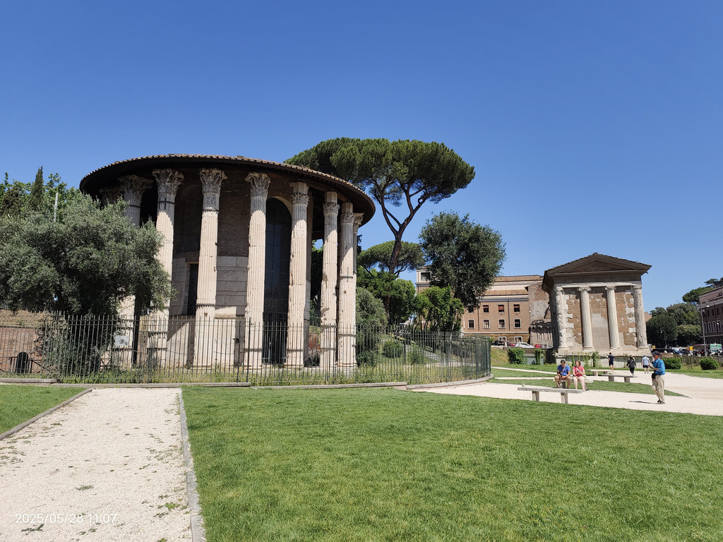 胜利者海克里斯神庙(左边圆形)位于真理之口对面,这是一座可以追溯至公元前2世纪的神庙,神庙所在的广场叫做屠牛广场,是古罗马的牲畜市场,但民间信仰相信苍蝇和狗都不会进入神庙。