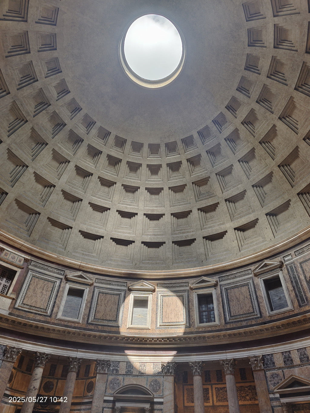 穹顶的圆洞,这个圆洞是露天的,没有玻璃覆盖,阳光会透过圆洞射进神殿,部分学者认为这是将太阳神请进神殿的方式,也有学者认为这是一个巨大的日晷——太阳射入神殿的光线会根据太阳的移动而改变。4月21日,这一天的正午时分,太阳光会投射在万神殿入口处,而4月21日也正好是罗马建立的日期。