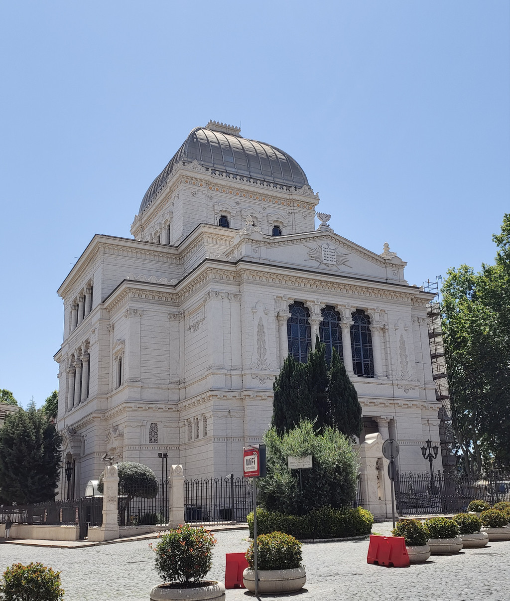 罗马大犹太会堂是罗马最大的犹太会堂,现在的犹太会堂修建于1870年意大利统一后不久。建筑包括了亚述-巴比伦、古埃及、希腊-罗马建筑元素。建筑的折衷主义风格令其十分醒目。犹太人社区当时有意选择这种引人注目的设计,以作为他们获得自由的有形象征,并且可以从城市的多个地方看见。犹太会堂的铝质圆顶是罗马唯一的方形圆顶,使得这座建筑极易被识别。