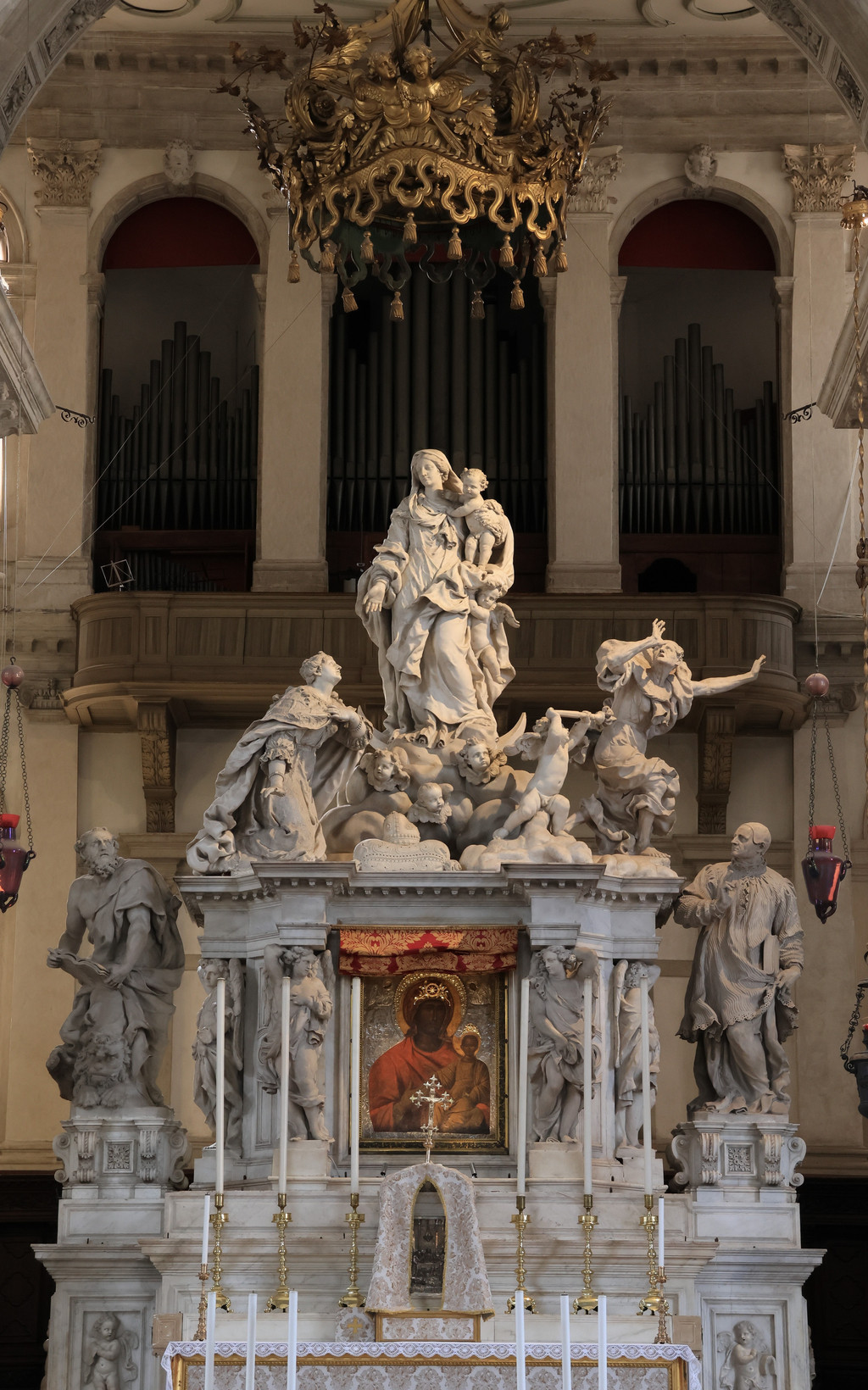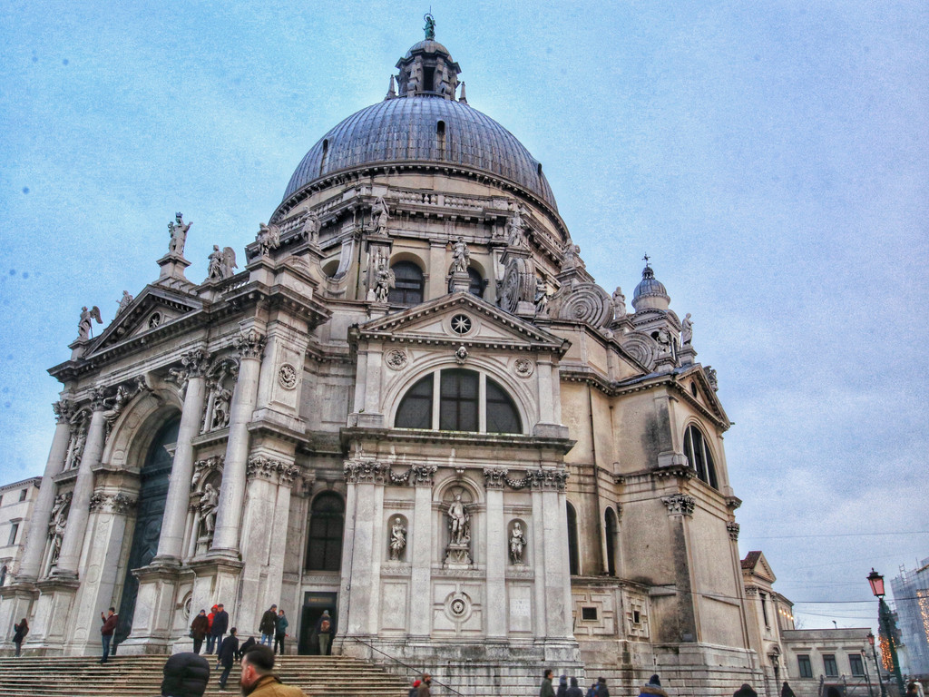 过了学院桥往东走,尽头就是安康圣母教堂,与圣马可广场隔河相望。它是威尼斯巴洛克艺术名家巴尔达萨雷·隆盖纳的杰作,公元17世纪,当时米兰的大瘟疫蔓延至威尼斯,夺去了市内三分之一人口的生命,瘟疫过后,威尼斯人认为是圣母玛利亚庇佑了他们,于是修建了此教堂。教堂主体为八角型,顶部为圆顶,周围有六座礼拜堂环绕。教堂主祭坛的圣器室内,有描绘旧约故事的壁画《大卫和歌利亚》、提香创作的天花板壁画以及丁托列托的《迦纳的婚礼》,非常值得驻足欣赏(可惜当天未开放,我们没有看到)。