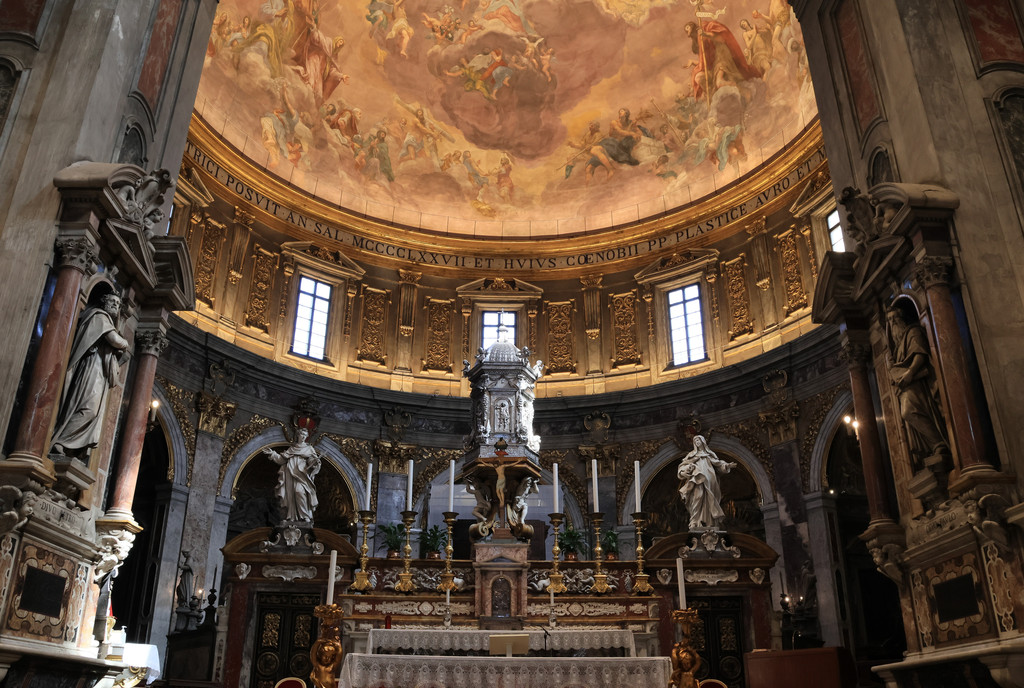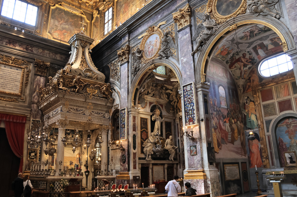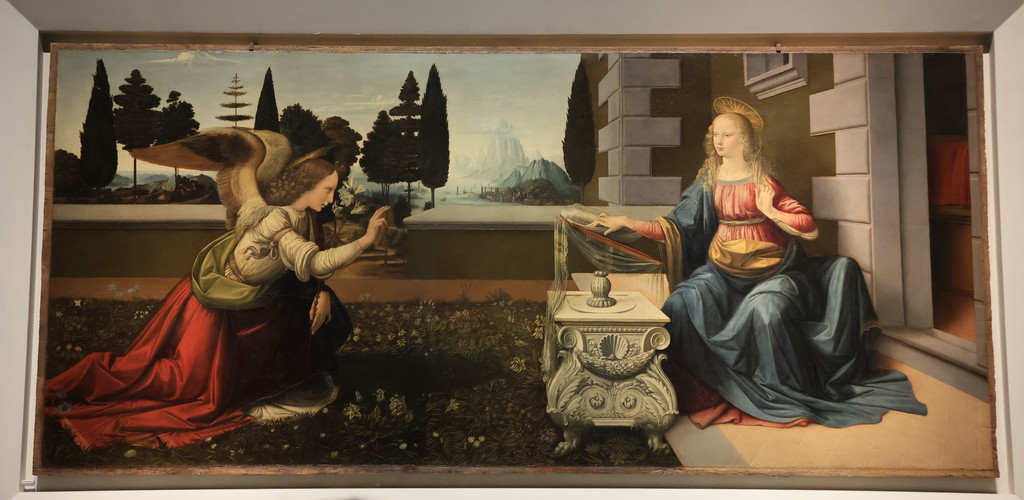 原计划这一天主要的行程只有圣母百花大教堂,既然教堂其它区域排队的人太多,我们就启动了闲逛模式。从大教堂往东北方向走,经过达芬奇博物馆(收费,我们没有进去),继续往前走就来到了圣母领报广场和圣母领报大殿(免费),这个教堂始建于1250年,因为其貌不扬所以被很多游客忽视,我们来到的时候正好赶上做弥撒,于是稍微等了一会才进去,里面华丽的装饰及雕塑绘画非常值得一看。