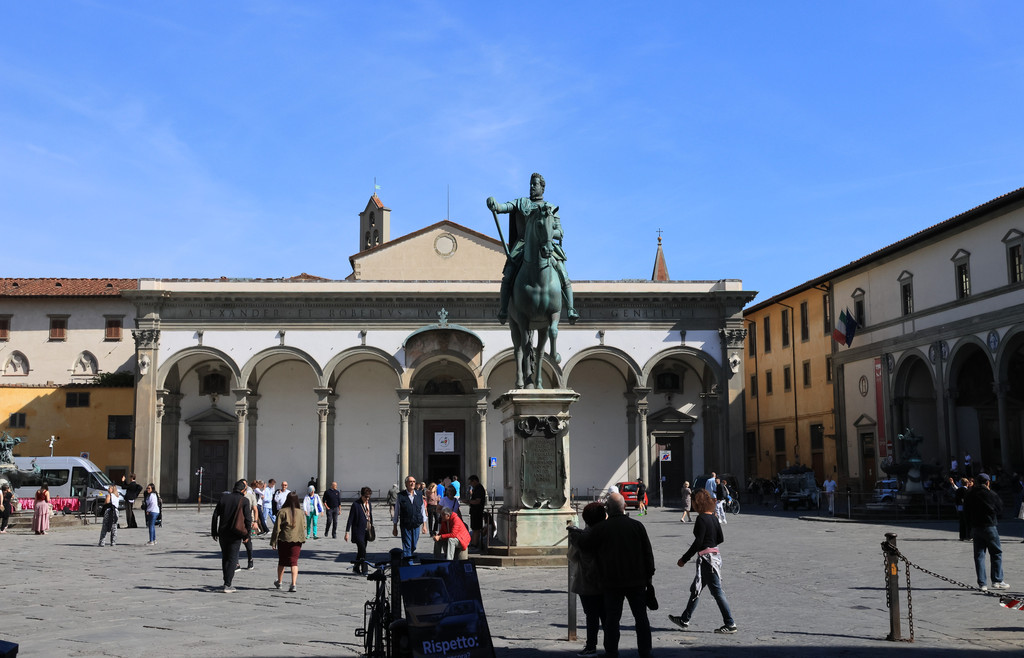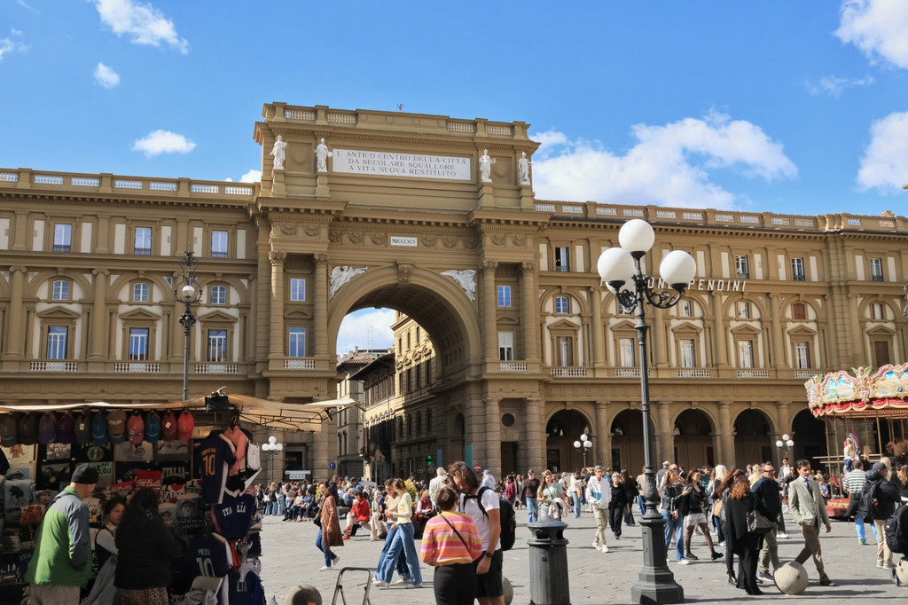 共和广场是佛罗伦萨市中心的一个重要历史广场,19世纪意大利统一后,佛罗伦萨曾作为临时首都,在此期间,广场经历了大规模的改造,形成了现今的新古典主义风格,广场的标志性建筑就是胜利拱门,上面刻有铭文:“古老的城市中心从百年的荒芜中重获新生”。广场周边围绕着精美的拱廊建筑,最有名的就是Gilli咖啡馆,据说已经有近300年的历史了,可惜我们时间有限,就没有体验。