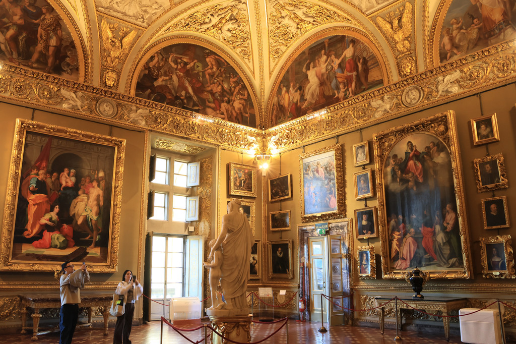 从乌菲兹美术馆出来后,我们经过老桥前往皮蒂宫。皮蒂宫最初是佛罗伦萨的银行家卢卡·皮蒂的住所,后被美第奇家族购买,并作为托斯卡纳大公的住所。皮蒂宫通过瓦萨里长廊和乌菲兹美术馆、韦奇奥宫(旧宫)相连,里面收藏了大量的绘画、珠宝、雕塑等。我们一方面是因为刚刚参观了乌菲兹美术馆,另一方面在这里没有请到讲解导游,所以只好“走马观花”的转了一圈。