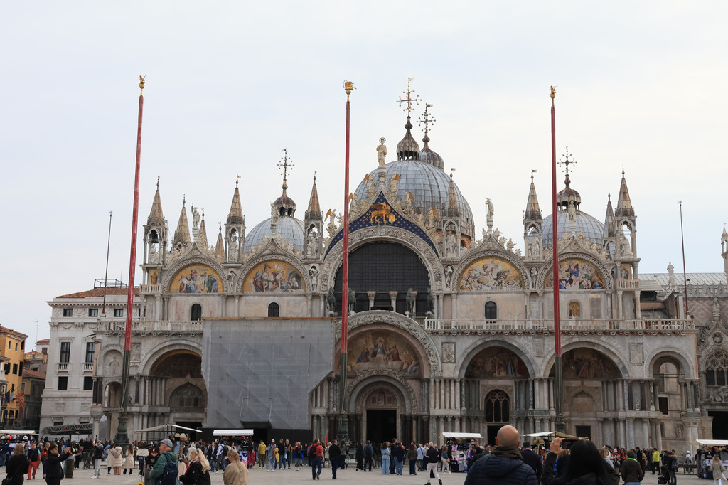 圣马可广场东侧就是圣马可教堂(收费)与总督宫毗连,建于公元828年,后因火灾在11世纪重建,之后用来收藏十字军东征时期从各国掠夺回来的宝物。大教堂以拜占庭风格为主,揉和了罗马、文艺复兴和哥特式等装饰风格,可谓是四不像。教堂由五个巨大的圆顶作为主厅,两个回廊式作为前厅组成,从上空看是一个巨型的希腊十字架。五个圆顶厅仿自土耳其伊斯坦布尔的圣索菲亚大教堂,极具拜占庭风格。教堂门口树立的三根旗杆,分别代表了威尼斯王国鼎盛时期的三个岛屿,是这座水上城市辉煌历史的见证。