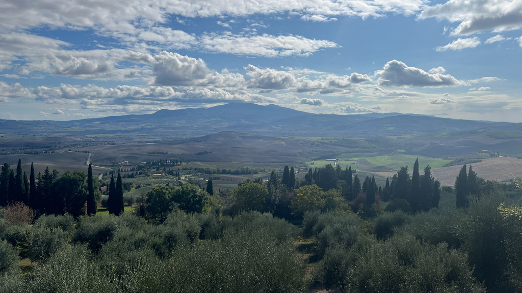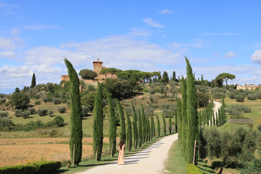 第二站司导带我们前往奥尔恰谷,车程1小时左右。这个山谷横跨托斯卡纳山丘地带,以优美田园风格的自然景色吸引了无数游客。这里的丝柏树群是奥尔恰谷地的标志性景观,据司导说,网上最出片的观景点(S型丝柏树),由于游客太多,所以不得不关闭了,但是好在整个奥尔恰谷地有很多类似的观景点,他会带我们前往拍照。虽然当天有些刮风,但是同团的几个年轻小姐姐兴致都非常的高涨,果然是一生爱出片的中国女孩儿呀。