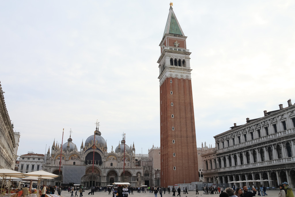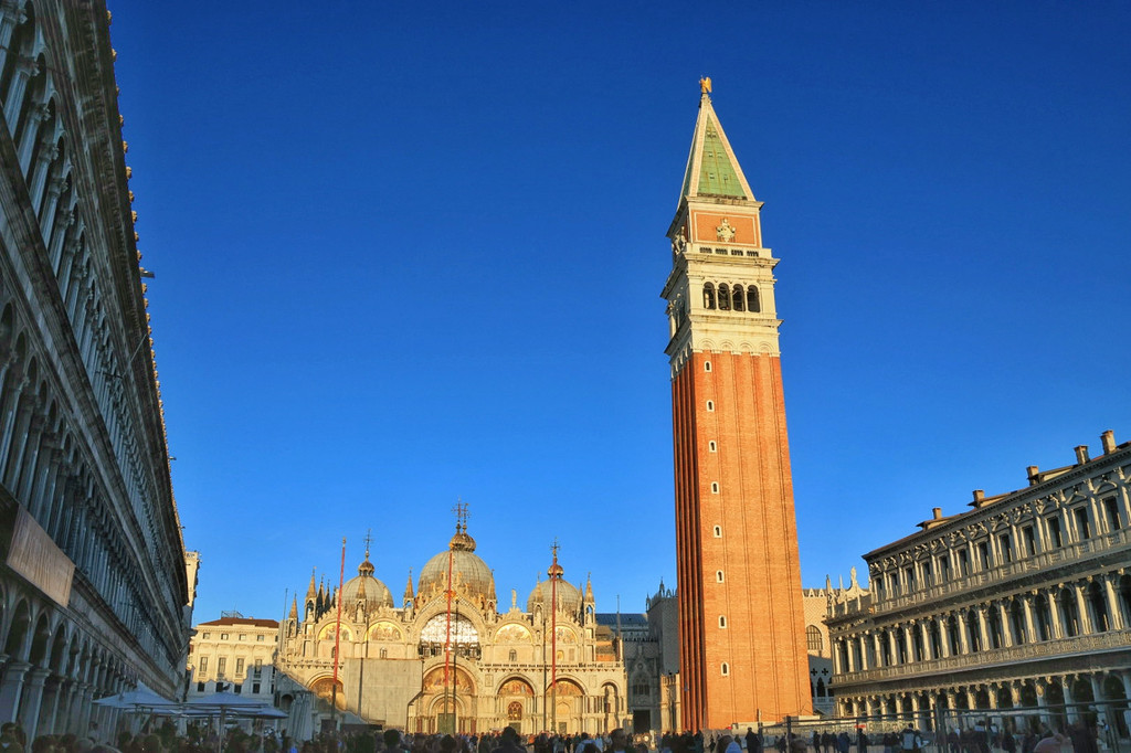 圣马可钟楼(收费,好像是15欧元/人)高98.6米,砖红色的外观,构造简单却不失美观,可以搭乘电梯上到楼顶,俯瞰整个城市的风光,天气好的甚至可以看到西北方的阿尔卑斯山。