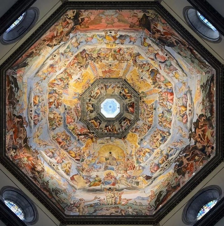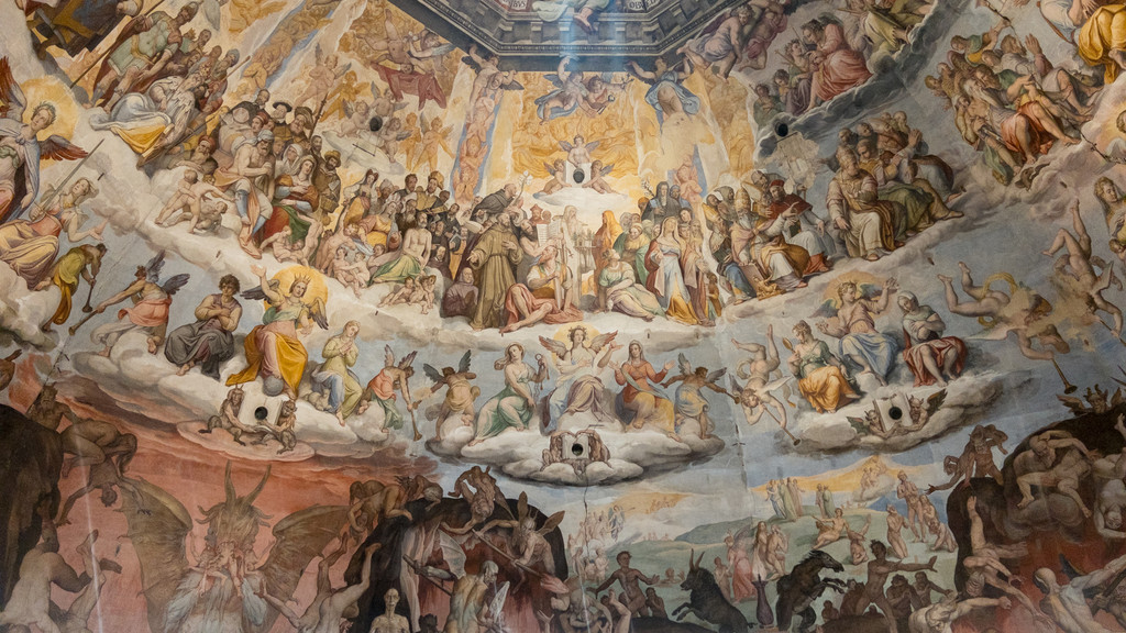 圣母百花大教堂(全区域)有5个入口,分别对应的是布鲁内莱斯基穹顶、主教堂、教堂地宫、乔托钟楼、大教堂博物馆,也就是说如果想要全部转完,需要排5个不同的队伍。在这里不得不吐槽一下,我在国内做攻略的时候,所有的游记都说要买票要买票!但是只字不提穹顶的票怎么买,包括X程上提供的联票,都不包含穹顶。在这里我给各位看官说明清楚,大家可以通过苹果自带的地图,搜索圣母百花大教堂,然后点门票,会弹出两个链接,一个是网站getyourguide.com,另一个是Tiqets(APP,只限苹果手机,安卓好像搜不到)。也可以直接登录网站getyourguide.com,或者在苹果手机里下载Tiqets,然后选择布鲁内莱斯基穹顶和大教堂的联票,确认登穹顶的时间(除了穹顶需要按指定时间外,其余部分可随意安排,3天内有效),付款(需要支付欧元,按当日汇率计算)后会将订单发送到你指定的邮箱,提前打印出来备当日现场验票,用APP的也可以直接在APP里查询电子订单。我是用的苹果手机下载APP,比从网站上买票要便宜一些,通票56欧元/人,我们预约的是早上9点的场次登穹顶,从大教堂北侧入口进入,每场45分钟,大概也就三四十人吧。因为登穹顶需要爬463级台阶,为了防止在顶部聚集太多人,所以每场的时间和人数限制还是比较严格的,时间到了就会有工作人员指挥游客退场。在爬到靠近穹顶顶部的平台后,当3600平方米的巨幅天顶画《末日审判》呈现在眼前时,震撼到我一度词穷,不禁感叹在600多年前,布鲁内莱斯基究竟是怎样设计出如此结构的建筑?佛罗伦萨的工匠们又是如何完成它的建设?瓦萨里又是怀着怎样的心情绘制这幅天顶画?怪不得有人说“在这很久未曾诞生非凡能工巧匠的世界上,建起如此一座崇高、美丽的穹顶,乃是天意”。圣母百花大教堂见证了美第奇家族的崛起,揭开了佛罗伦萨的序幕,更证明了人类有能力征服最不可能完成的任务。