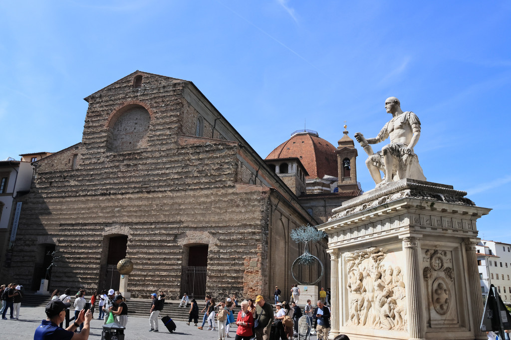 学院美术馆(收费)建于1562年,是佛罗伦萨美术学院的附属美术馆,以米开朗基罗的大卫像而闻名于世。大卫雕像本来安放在市政广场,但是它太受欢迎,为了保护雕像的安全,于是学院不得不把它挪到室内,现如今佛罗伦萨的各大广场都有它的复制品。学院美术馆周边的道路并不宽阔,当天排队参观的人非常多,以至于把路几乎占满,我们只好作罢,好在我们提前预约了后天的乌菲兹美术馆,这一趟艺术之旅也一定会大有收获。往西南方向继续走,就来到了美第奇家族礼拜堂和圣洛伦佐大教堂(收费),这里曾是美第奇家族的专用教区教堂,礼拜堂现为美第奇家族成员的墓地。我们没有进去,只是在周围转了一圈。