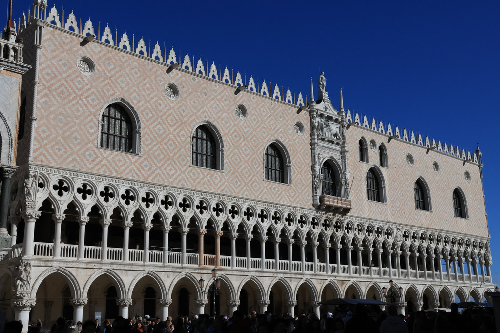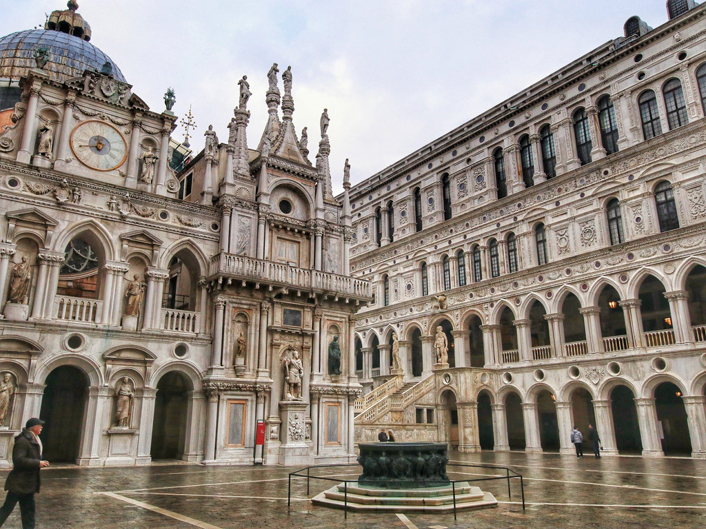 总督宫(收费,30欧元/人)是昔日威尼斯共和国的权利中心,1574年遭遇火灾后进行了重建,延续了原来的哥特式风格,总督宫与东侧的监狱通过叹息桥相连接。进入中庭,可以看到很多文艺复兴风格的大理石雕饰,庭院的地上有两口雕刻精细的青铜蓄水井,过去这里面储存的水是威尼斯质量最好的,很多商贩来这里取水后拉到外面去卖。庭院的尽头就是黄金阶梯,建于公元16世纪,可以说是金碧辉煌,历史上只有贵族或者尊贵的宾客才能登上这个阶梯进入总督宫。如今的总督宫是一座博物馆,每座展厅都极尽华美(总督宫二楼以上不允许拍照),其中大会议厅内有威尼斯画派的代表人物丁托列托的巨型壁画《天堂》,取材于但丁的《神曲》,画中有700多个人物,被誉为世界上最大的油画。