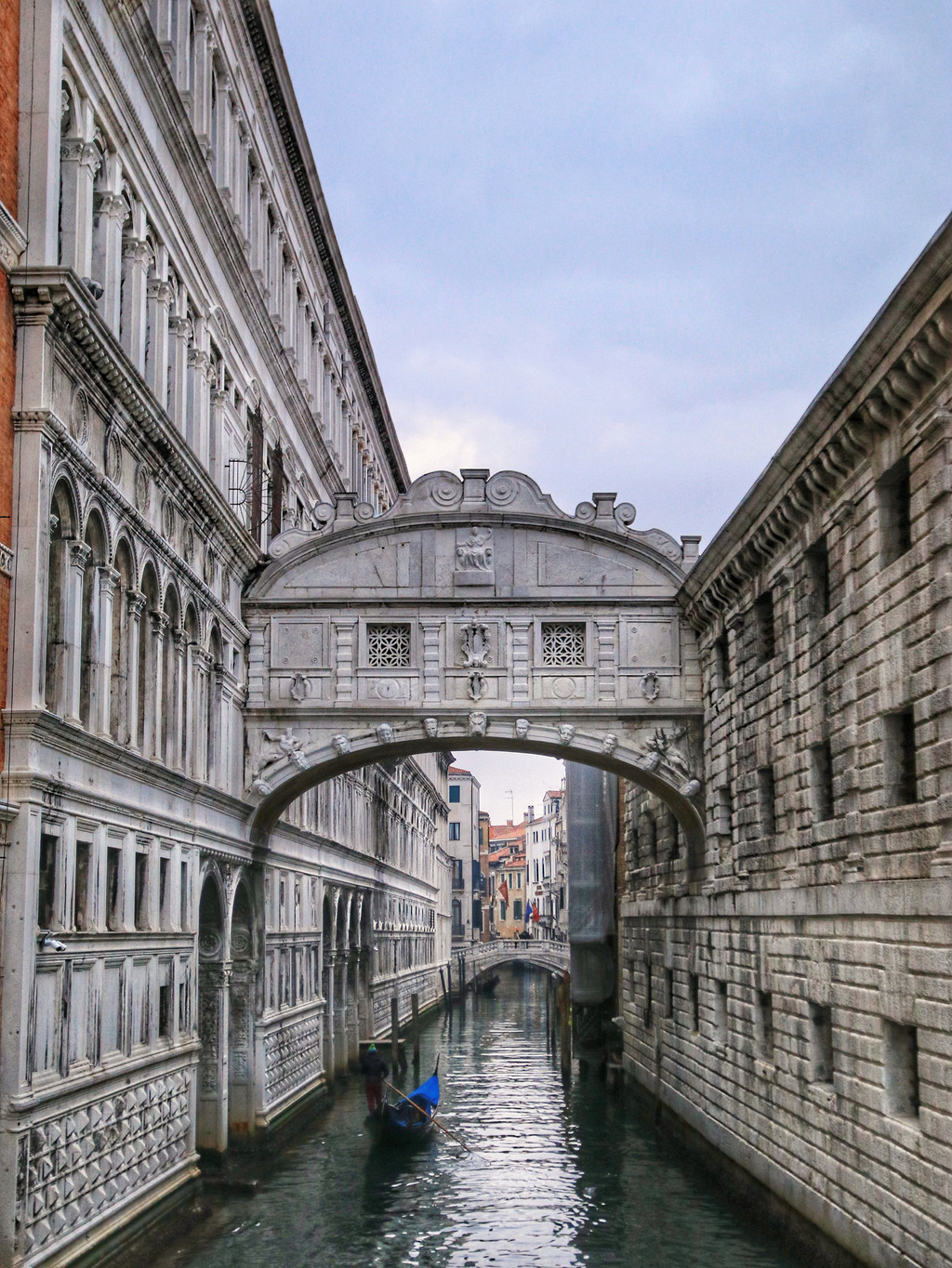 按原路返回,过了学院桥后,我们往里亚托桥方向溜达,在威尼斯的数百座桥中,除了叹息桥之外,里亚托桥就是最有名的了。整座桥身全部用白色大理石筑成,桥身上有许多精美的雕刻,现今的里亚托桥上都是商铺,出售合适各样的纪念品,这里也是拍摄威尼斯大运河的绝佳地点,如果天气好,在这里的拍日落也是非常的不错。