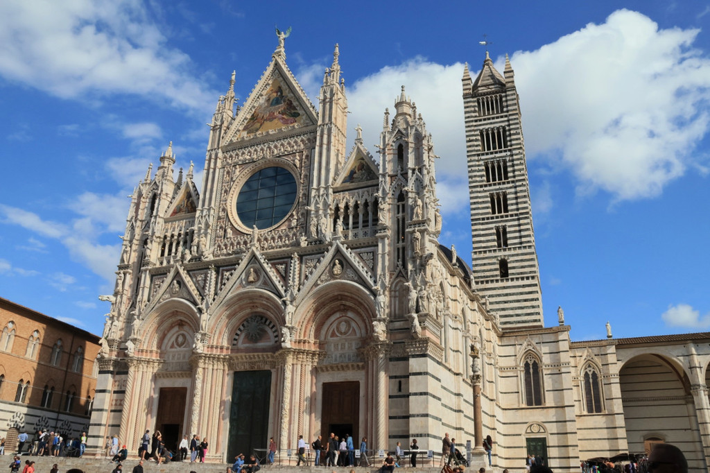 从田野广场西侧的小路爬坡上去,就是锡耶纳大教堂(收费,大概是8欧元/人),大教堂是一座未完全按照设计完工得建筑,整体具有罗马与哥特式教堂的风格。教堂的外墙以白色、墨绿色和粉色的条纹大理石为主,正面以华丽的立面雕像做装饰,虽然比不上圣母百花大教堂,但是也是意大利精美的大教堂之一了。因为拼团时间有限的原因,我们没有进入教堂内部参观,也是略有遗憾吧。