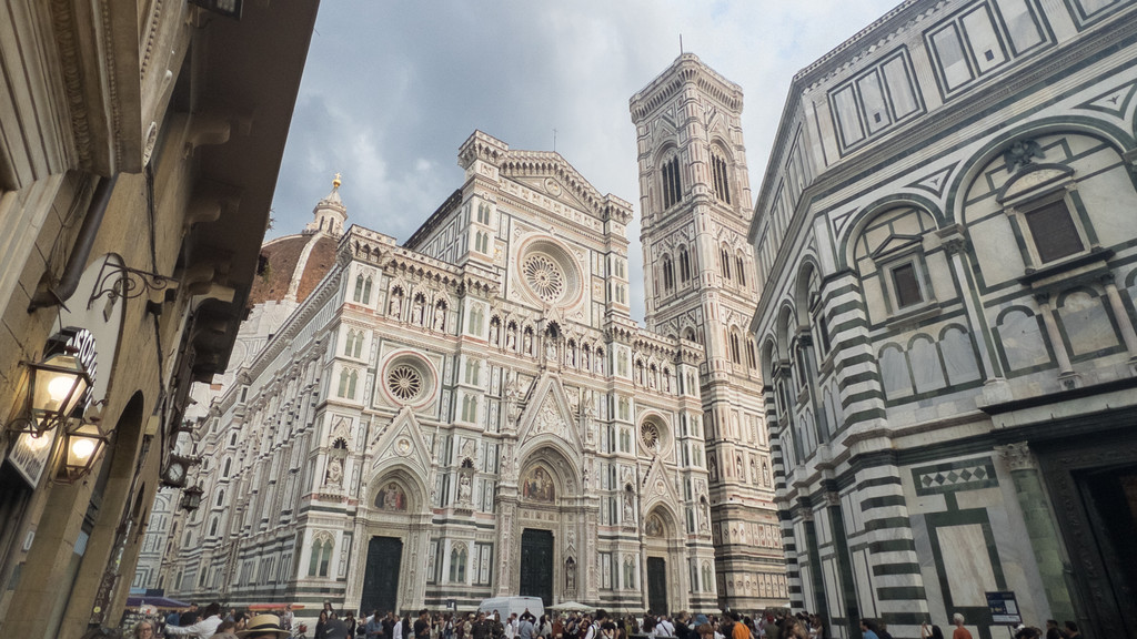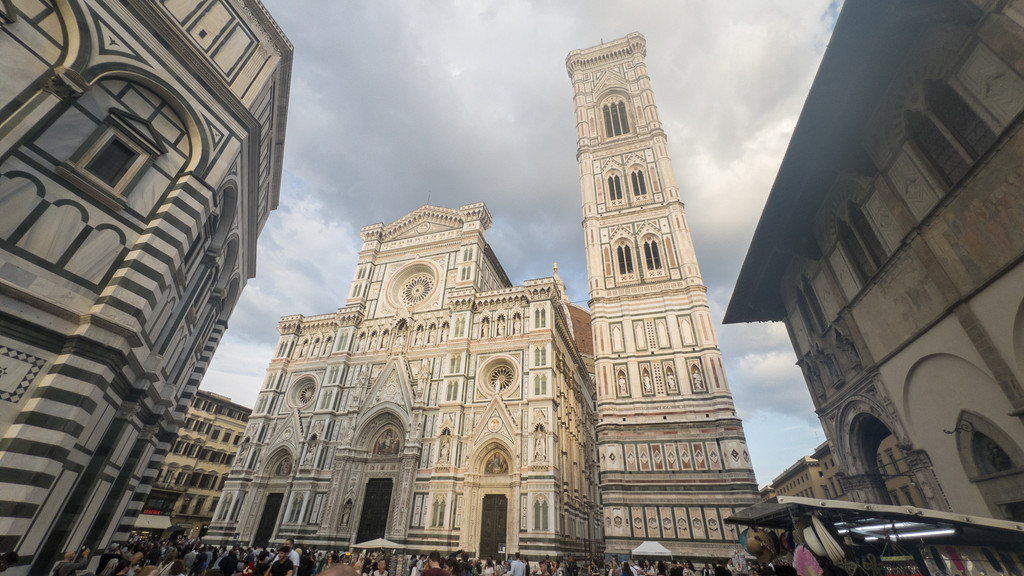作为佛罗伦萨最著名的地标建筑,圣母百花大教堂(除主教堂免费外其余部分收费)是天主教佛罗伦萨总教区的主教堂,也是世界上第三大教堂。整个教堂区域由主教堂、乔托钟楼、圣若望洗礼堂组成,不仅规模宏大,更是整个文艺复兴初期的代表性建筑。主教堂和乔托钟楼的外部使用深浅不同的白色、绿色和粉红色色调的大理石砖铺砌而成,虽然色彩斑斓但却显得纯净优雅,让人百看不厌。
