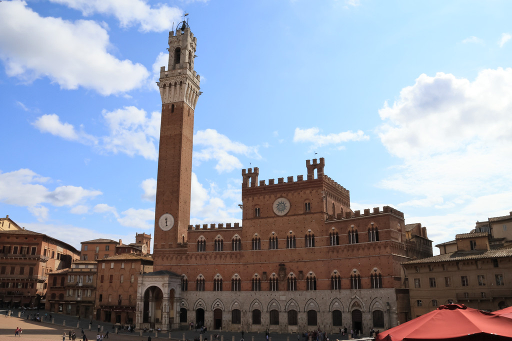 锡耶纳是一座颇具中世纪风格的城市,整个城市建立在几个山谷之间,建筑物比较密集而且高度统一,淡红色调的砖块和与周围暗蓝灰色的丘陵相协调,除了罗马和文艺复兴风格外,意大利哥特式风格也占了很重要的地位,它因为受到了十字军东征时期东方的影响,所以在此以狭窄的拱廊形式表现出来。锡耶纳老城区的面积很小,其中田野广场是城市的心脏,广场呈贝壳状,中间低四周高,东南侧就是市政厅,背靠曼吉亚塔楼,据说这里也是赛马节的露天竞技场。