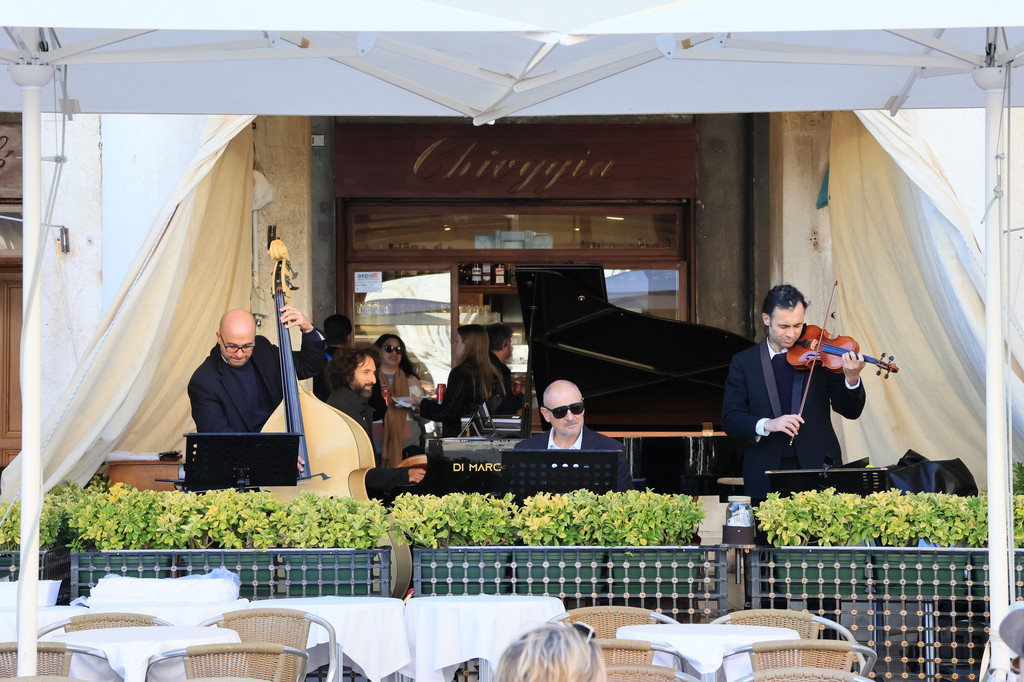 随着夜幕即将降临,我们回到圣马可广场,这里的餐厅,大都有自己的乐队,在这里点上一份简餐,配上一杯葡萄酒,一边听音乐,一边欣赏广场上的建筑,就像是我罗马篇中提到的,这就是意大利人的“松弛”吧。