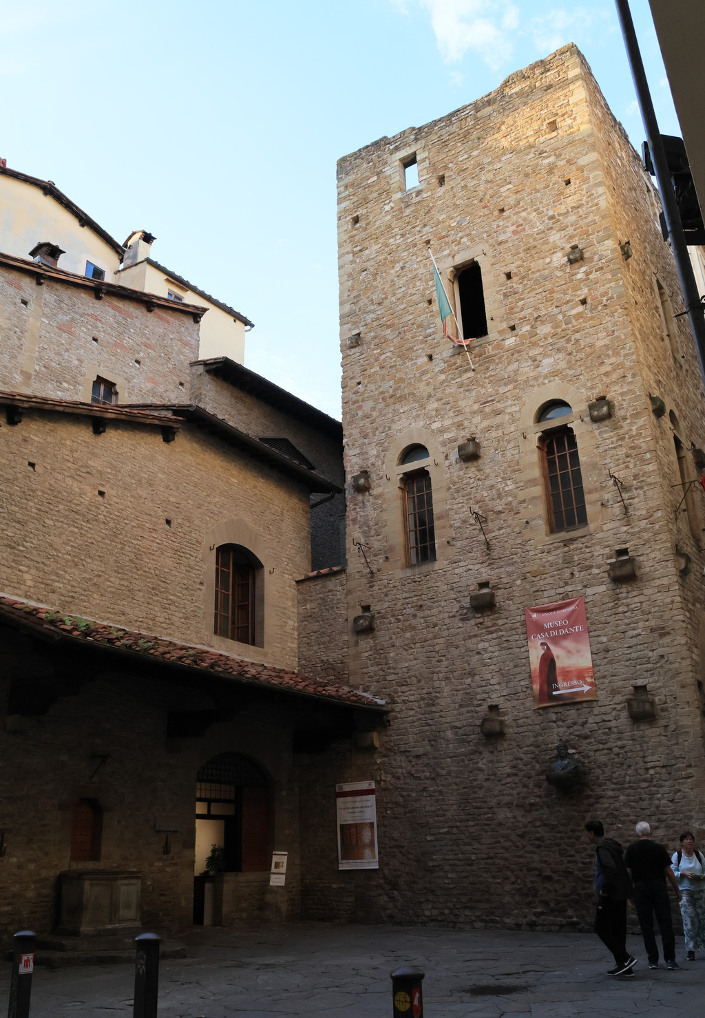 但丁故居(博物馆收费)是意大利文艺复兴前叶的伟大诗人但丁曾经生活过的地方。但丁以代表作《神曲》和《新生》闻名于世,他和彼特拉克、薄伽丘并称为文艺复兴前三杰。很多人说到文艺复兴,更多提起的是(后)三杰:达·芬奇、拉斐尔、米开朗基罗,虽然他们在绘画、雕塑、建筑等领域取得了举世瞩目的成就,但是就影响作用而言,我更偏爱前三杰。作为结束了欧洲黑暗中世纪的文艺复兴,这期间诞生的文学作品在广大人民中更易流传,它们对人们思想上的解放,是艺术作品无法做到的(以上纯属个人观点)。但丁故居位于佛罗伦萨圣母百花大教堂南边的一条小巷子里,中世纪塔楼的房屋融合在周围的建筑里,毫不起眼,现在的老宅内部已经改为博物馆,介绍了但丁的一生,陈列了但丁的一些作品和家族画册等。