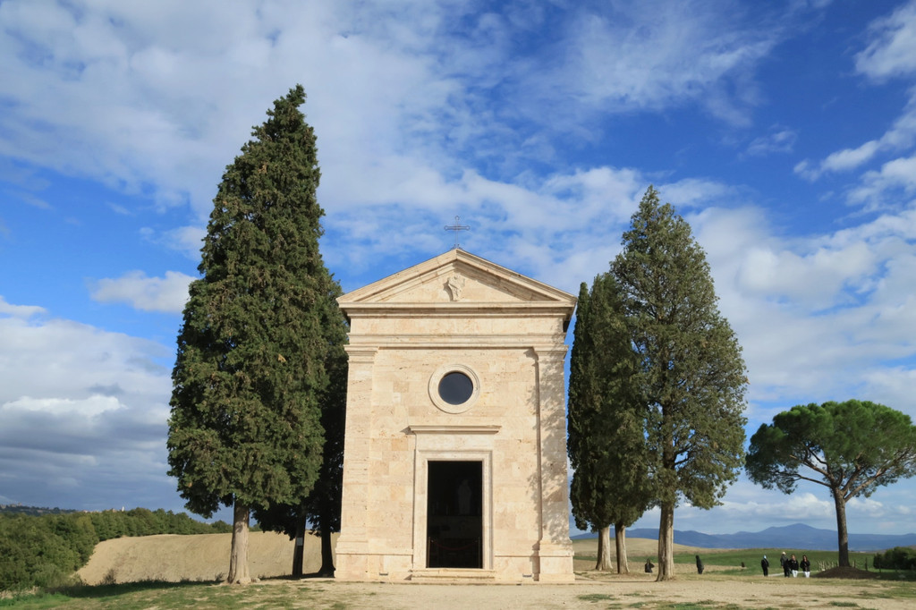 第四站小耳朵教堂,起名字来源于教堂两侧的柏树,形似精灵的耳朵,为教堂增添了独特的魅力。自从在电影《托斯卡纳的艳阳下》中出镜后,这里就迅速成为了摄影爱好者和网红们的打卡地。教堂建立在绿意盎然的丘陵之上,四周环境宁静,仿佛与世无争。