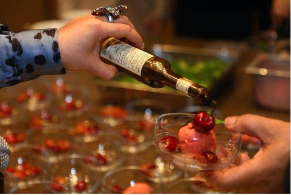将樱桃洗净,切成4份,然后放入一个装有意大利香醋的容器中。将准备的冰糕,水,糖,葡萄糖,草莓泥和稳定剂放入冰糕机。一切就绪之后,将樱桃倒入一个杯子里,然后在上面放上一块草莓冰糕和意大利香醋,只用薄荷叶来装饰。
