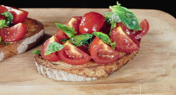 材料和做法都非常简单:先烤一下面包,再将新鲜便宜的番茄、罗勒叶、橄榄油、盐和黑胡椒混合后抹到面包上就大功告成啦。