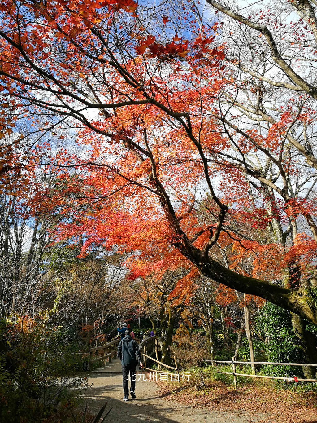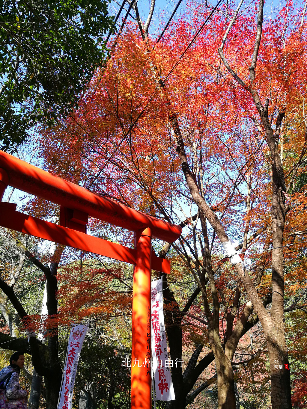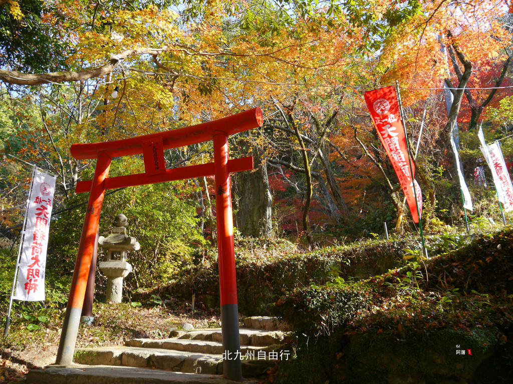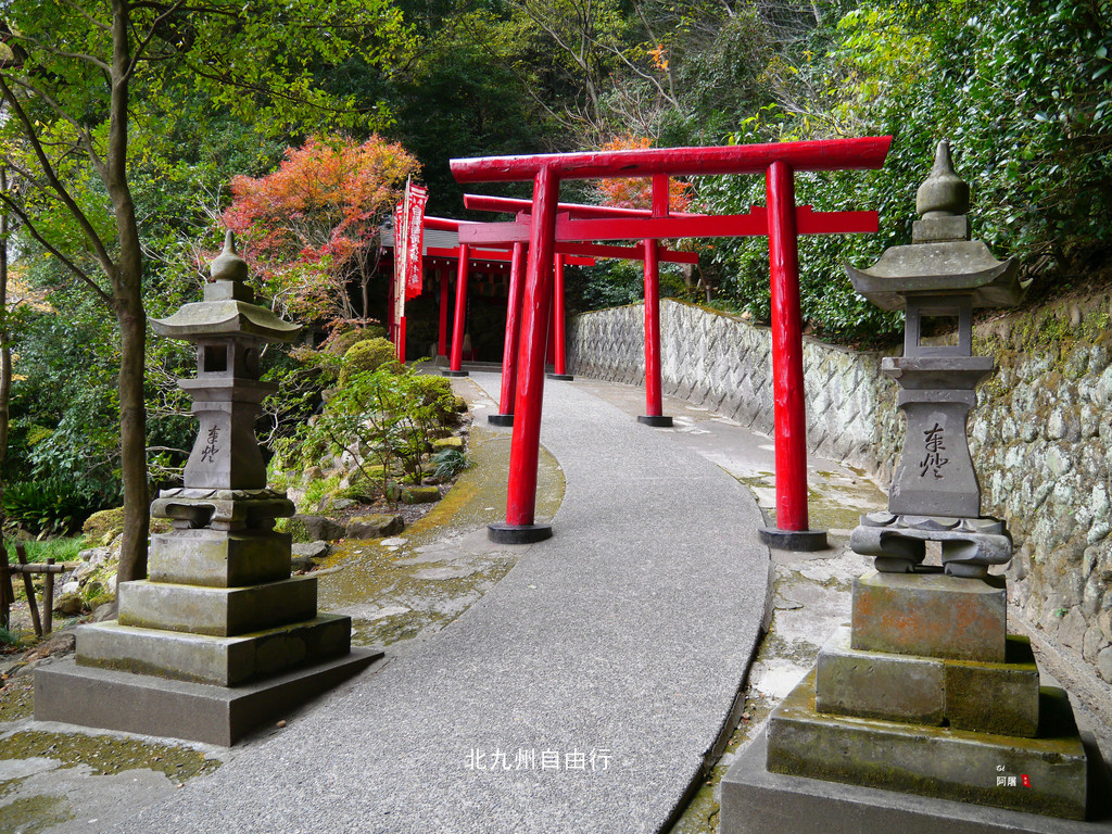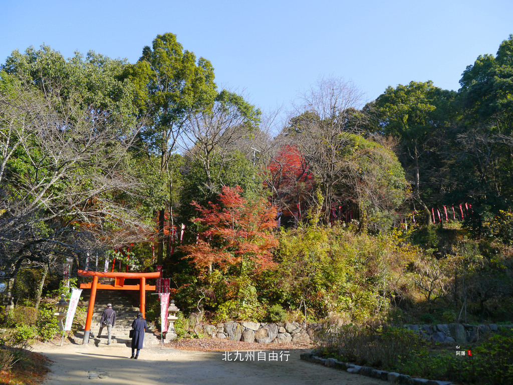 沿后面的山坡的红色鸟居上行,人少景美,一路上的枫树已经红了,很漂亮。