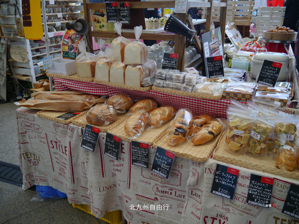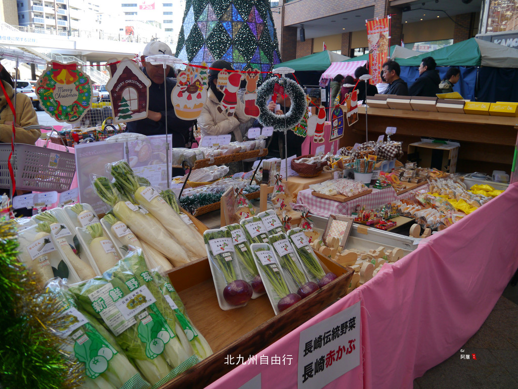 星期天的早上长崎火车站的广场成了农产品市场,看了看价格还比较便宜。买了一袋橘子100円,3个熟鸡蛋150円,一个大面包370円当中饭还吃不完。