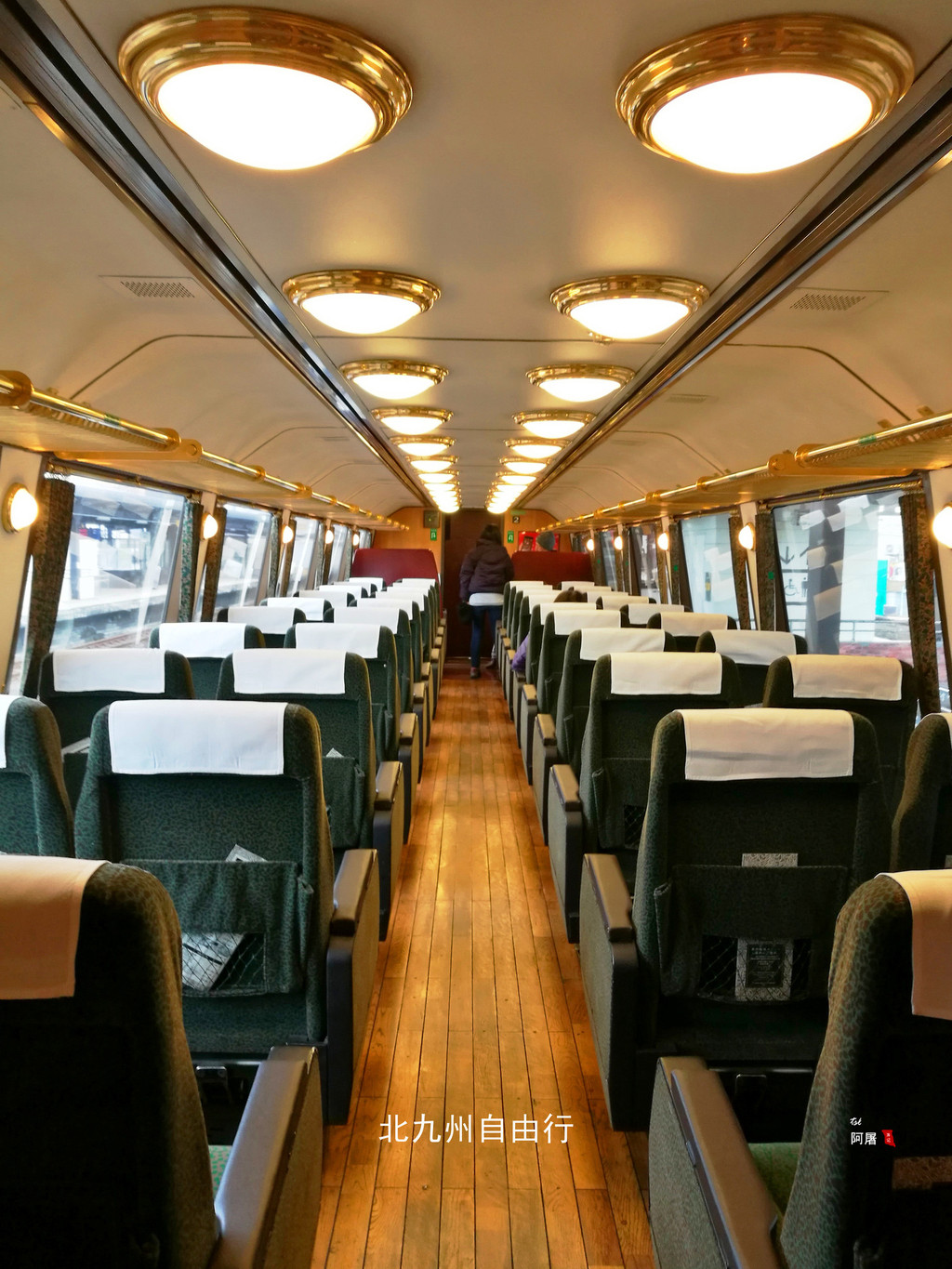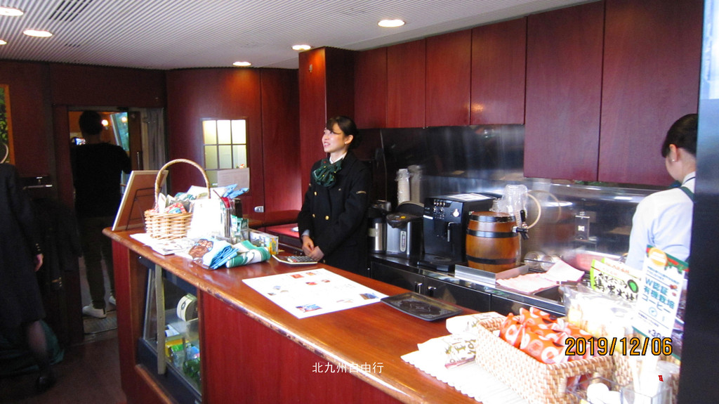 绿色的列车全程是指定席,车厢内装饰也不错。餐车提供火车便当。乘务员拿着拍照的道具给需要的乘客拍照留念。