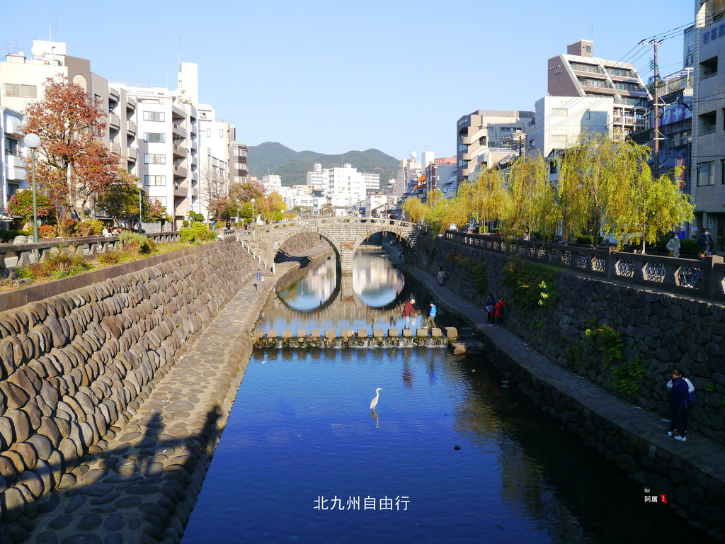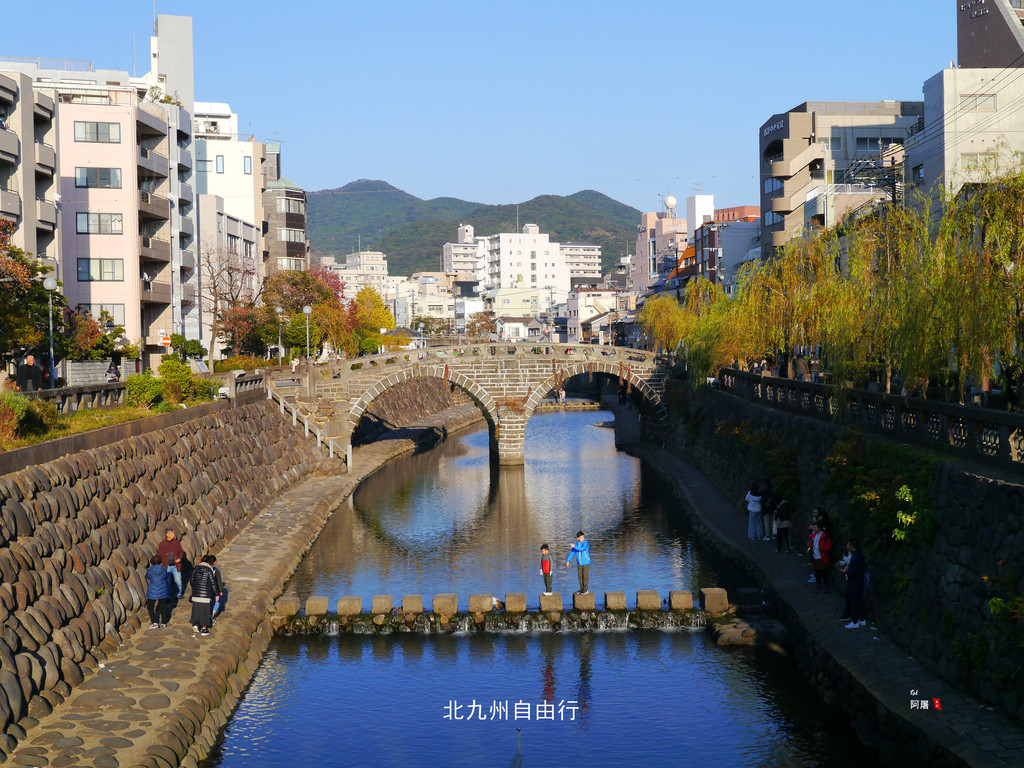 眼睛桥(Meganebashi)因桥在水中的倒影像眼镜而得名,是1634年由中国僧侣如定设计,一座石制的双孔拱桥。这座桥是全日本唯一一座石制拱桥。1960年被列为日本国家重要文化财产,是日本三大名桥之一,与东京的日本桥、山口的锦带桥齐名。