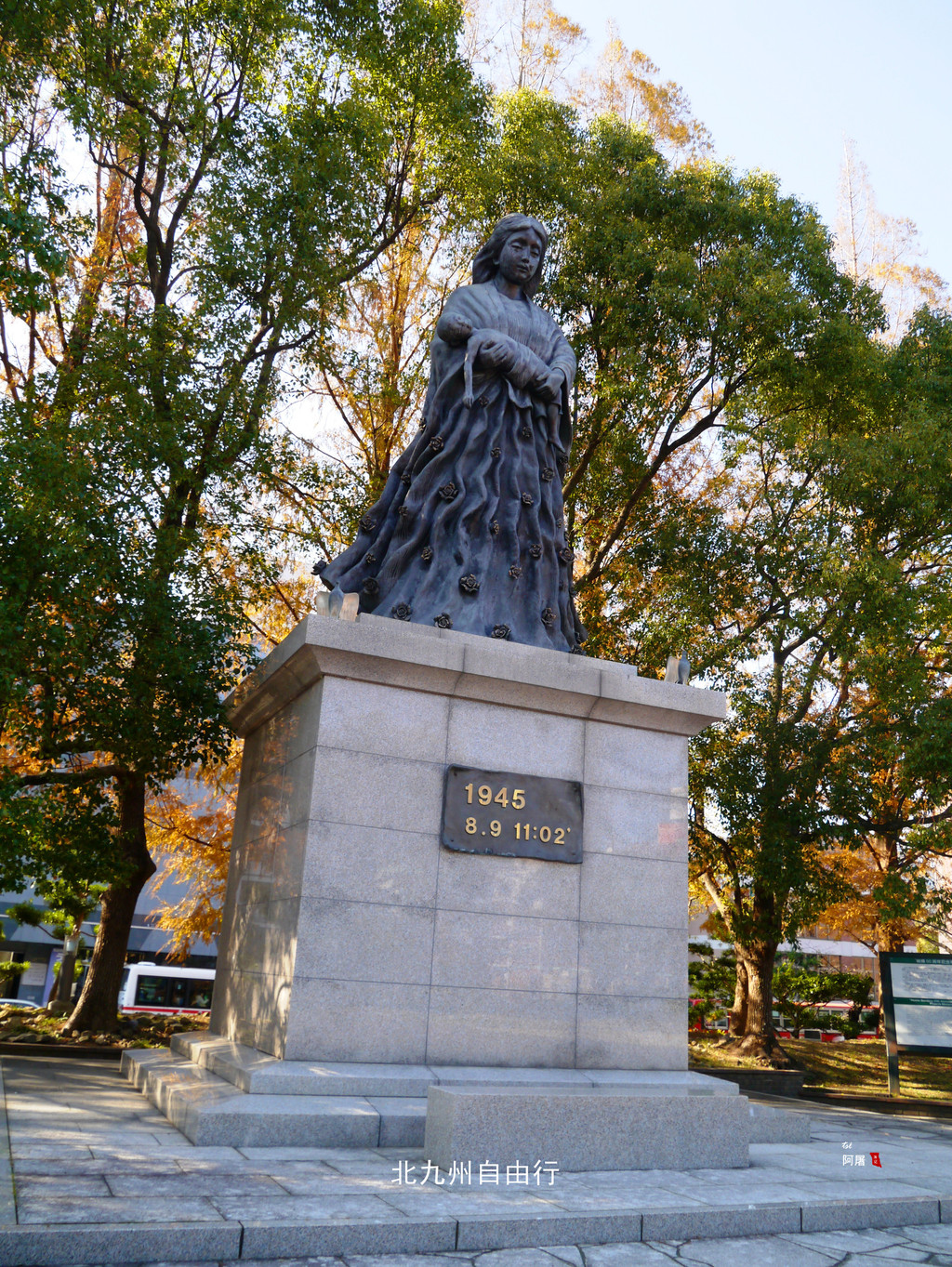 平和公园的隔壁是原爆落下中心地公园,这里才是美国投放原子弹落下的位置,有一个纪念碑,原本还有一个教堂,现在只剩下一堵墙了。公园中央那座抱着死去的孩子的母亲的塑像,让人感到震撼又悲伤,战争真的是噩梦。