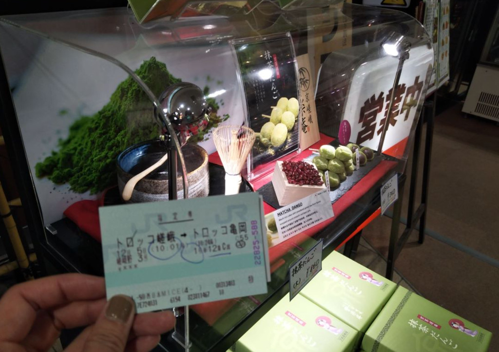 岚山小火车站 车站内有工作人员拿着有中英日语的牌子给游客讲解怎么买票(单程 或双程区别)大家不要急,认真看,都没问题的