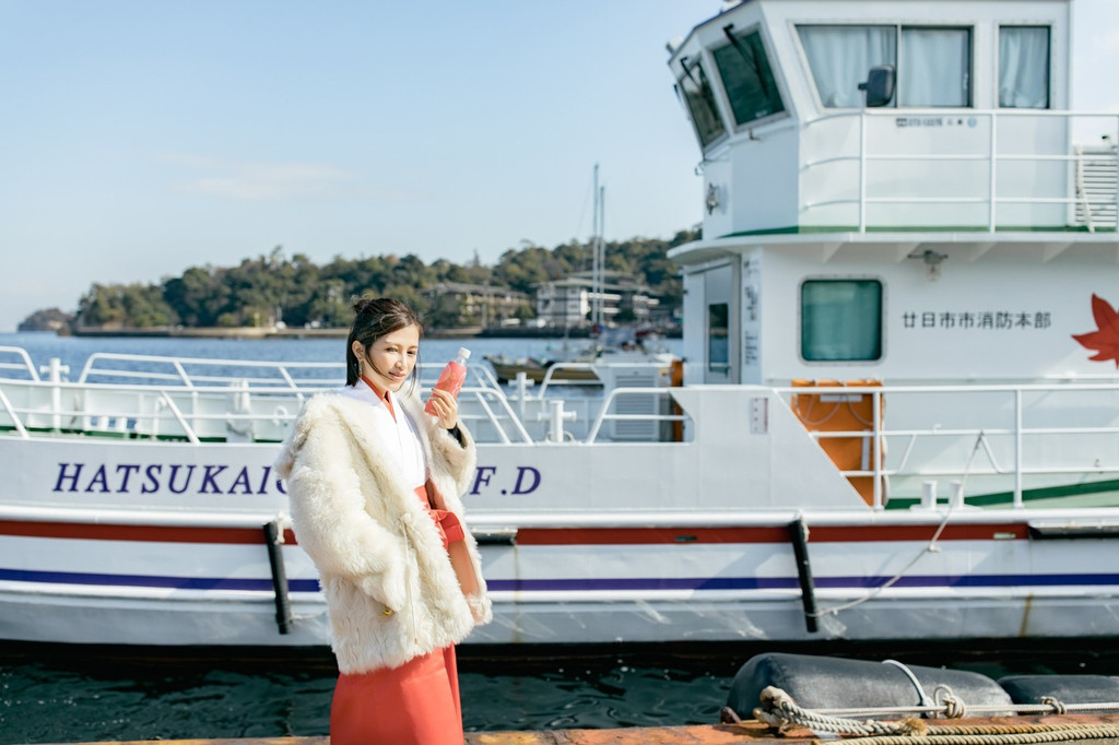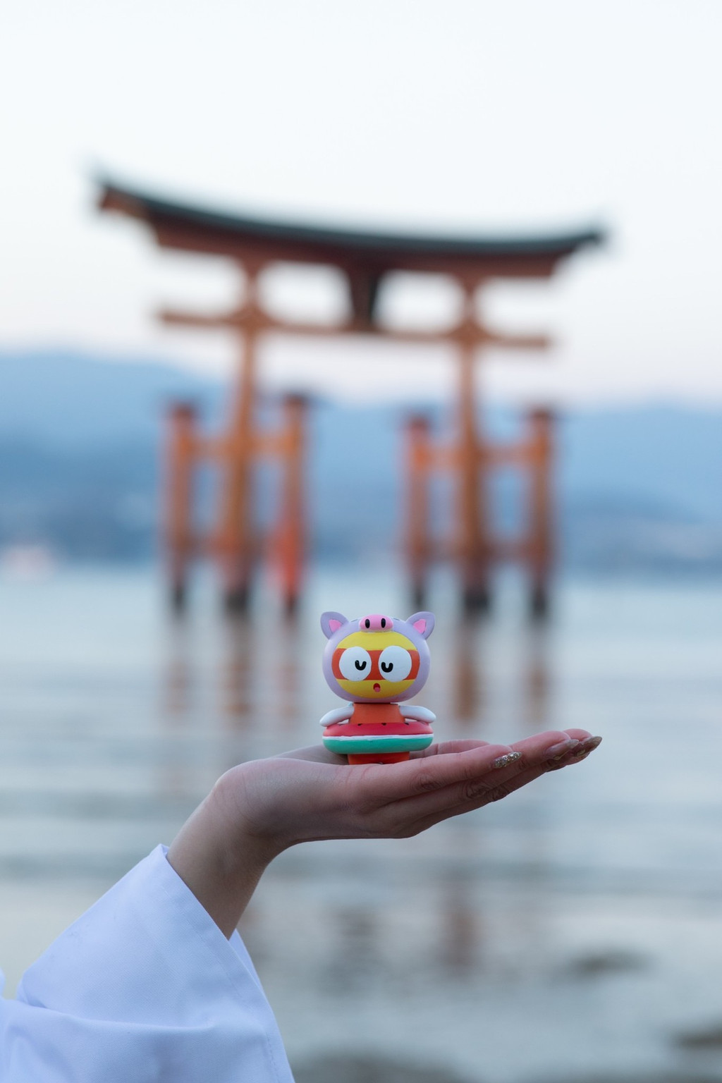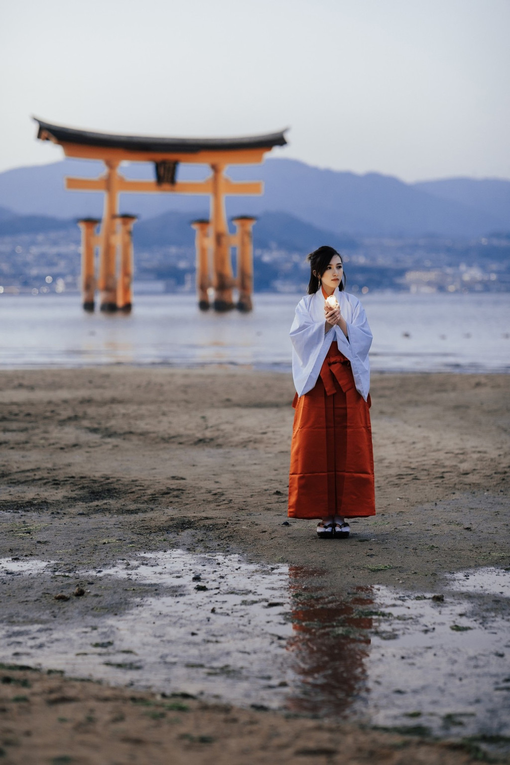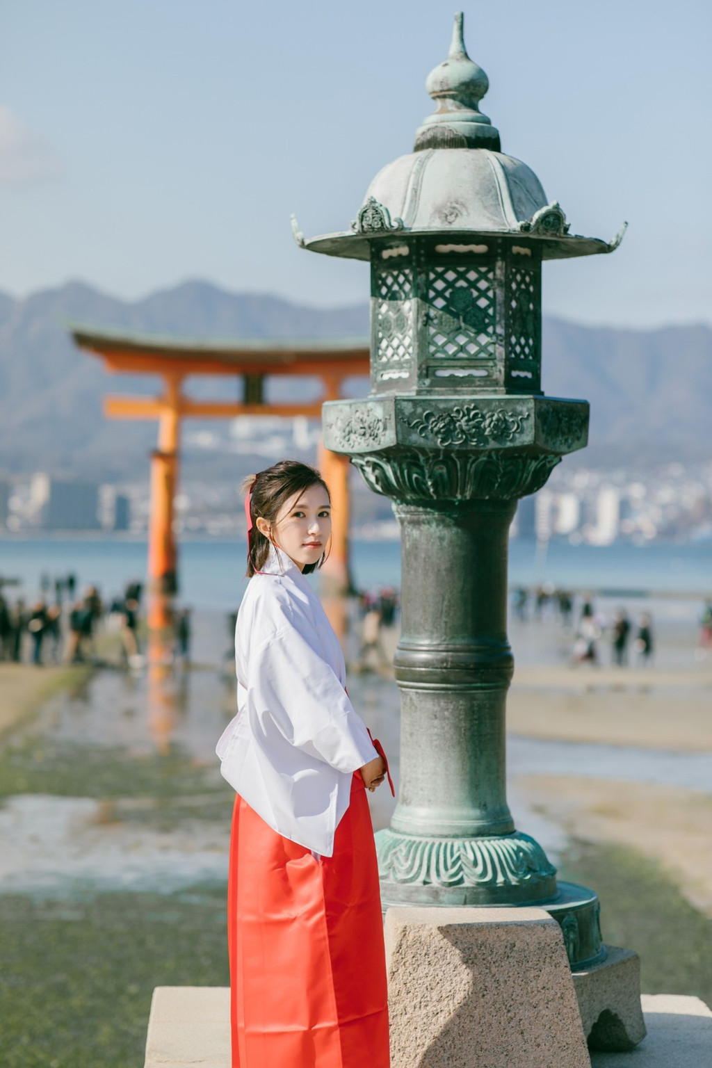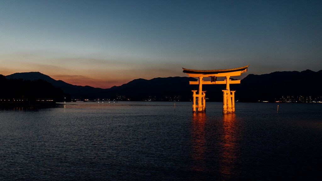 站在岸边,可以远远看到矗立着的大鸟居,宫岛的象征——大鸟居(意为进入神社之门)据传是为欢迎海中诸神驾临岛上而设。朱漆的大鸟居选用未经加工的楠木制成,高约16 米,上梁为24 米。它靠自重矗立于濑户内海的万顷碧波之上,显出其特有的巍容。