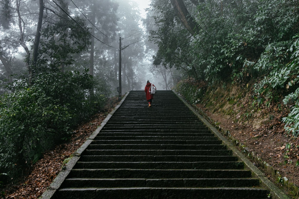 一回头,发现衣刀在我身后好多,哈哈哈,就听着他喊着:“怎么还没到啊!还有这么多层啊!我的老腿啊!你等等我啊!” 还真是一抬头,茫茫之路啊!加上山间的雾气,仿佛走进仙境里,不知道前方还有多少阶梯等着我们。