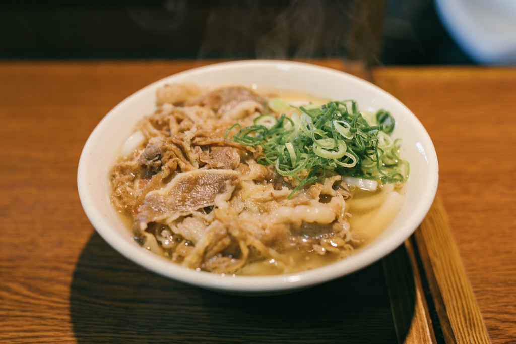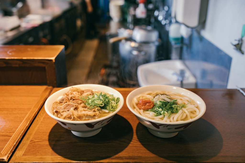我和衣刀分别点了牛肉面和梅子乌冬面。猜猜看谁是肉食主义者?